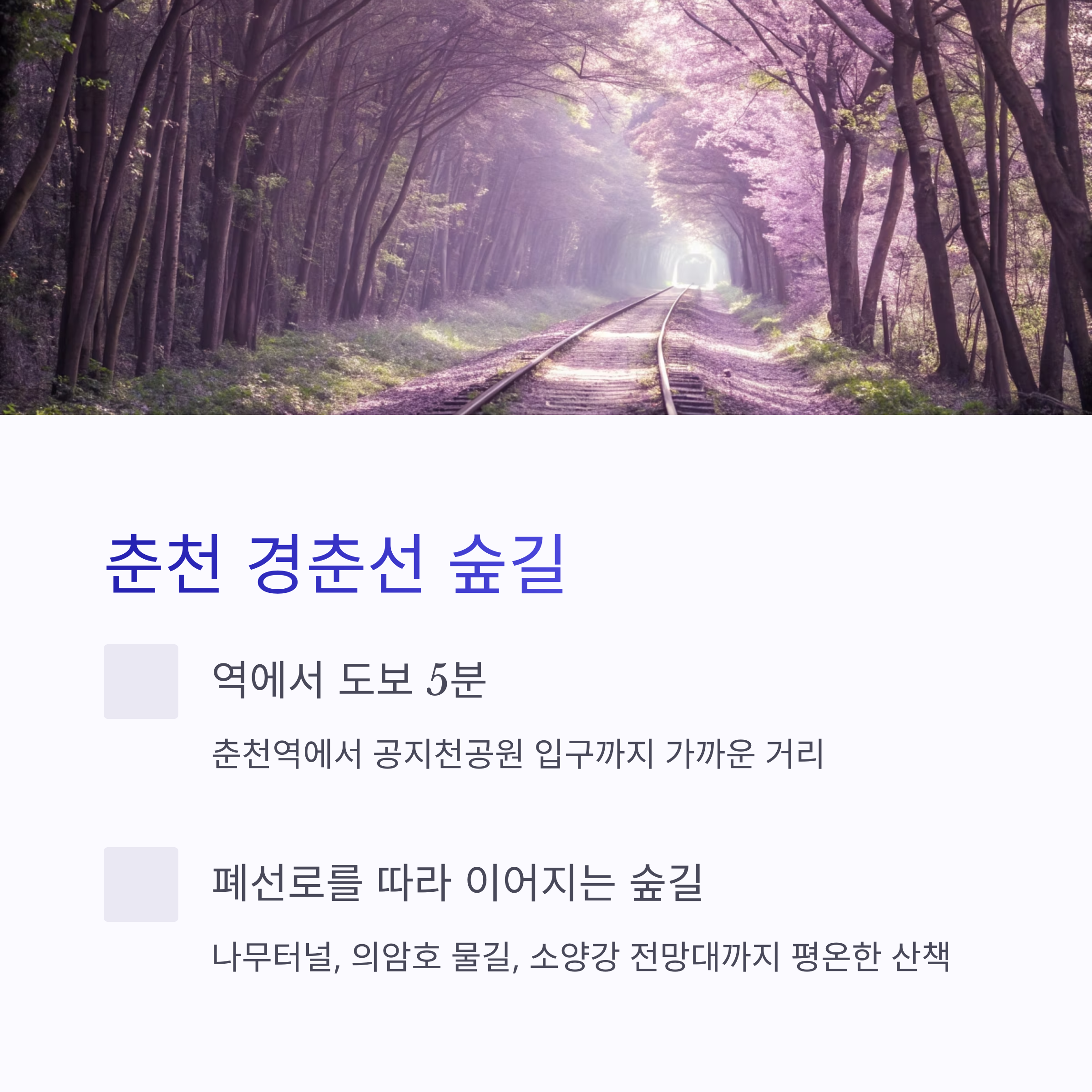 | 춘천역 | 약 5분 | 경춘선숲길 |