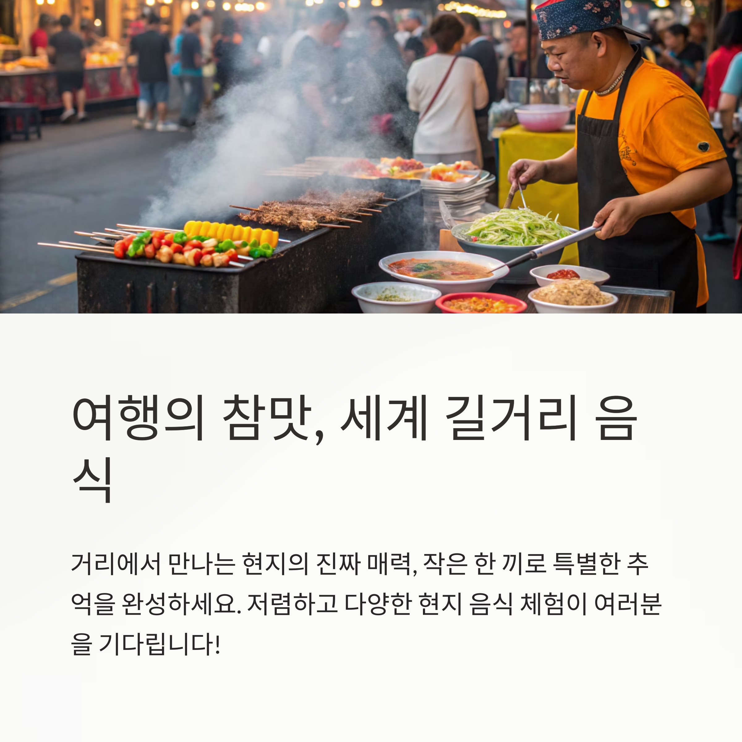 여행 중 발견한 최고의 길거리 음식을 댓글로 알려주세요! 함께 세계의 맛을 공유해봐요.