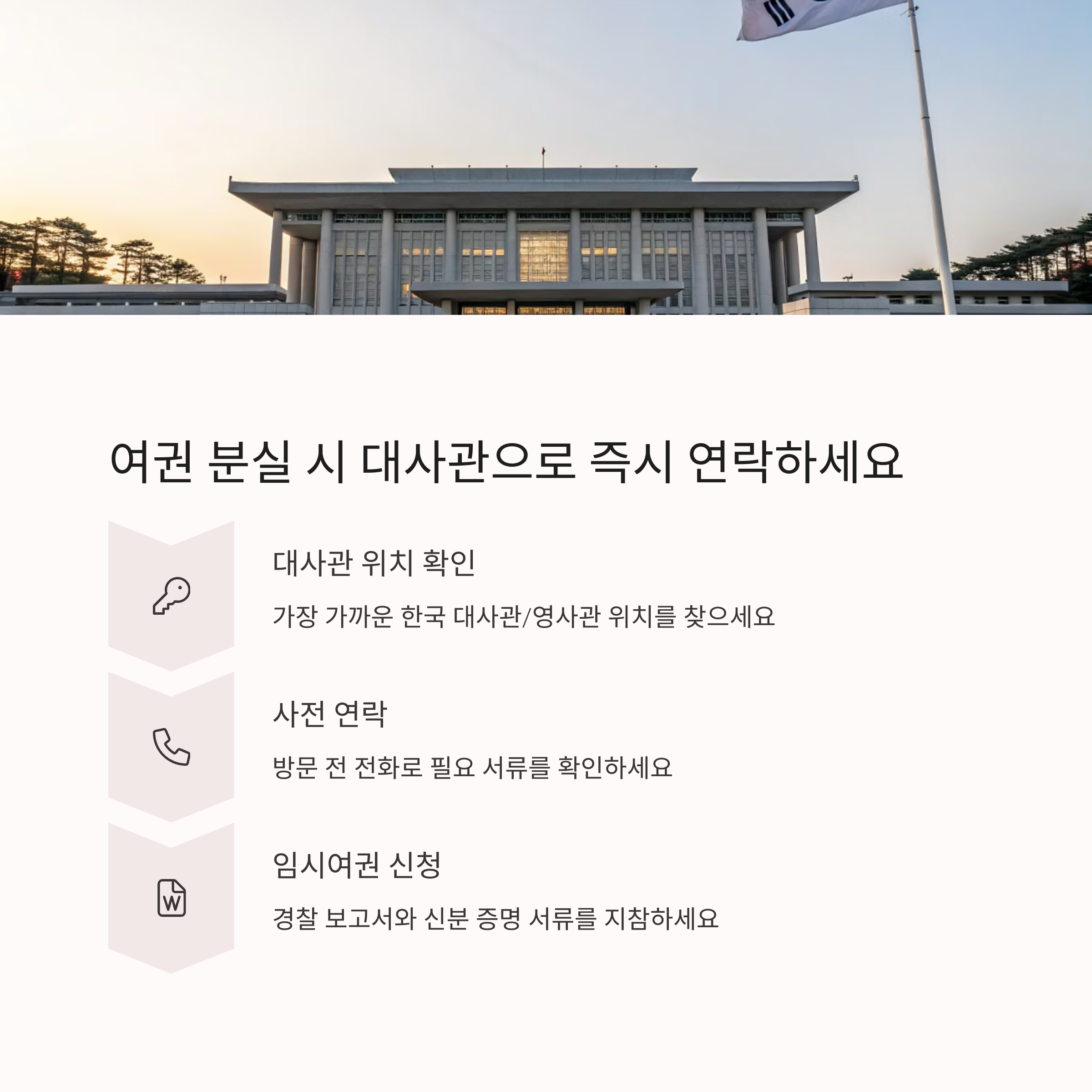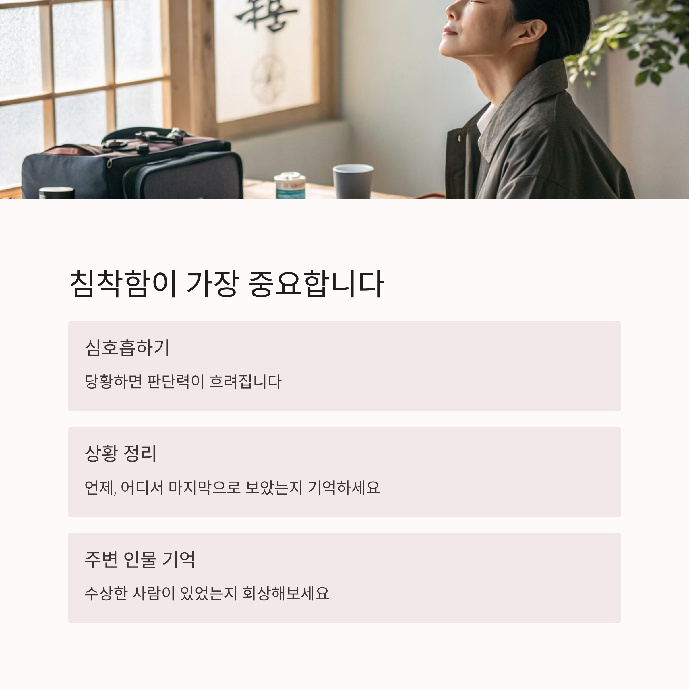 | 침착 유지 | 경찰 신고 | 대사관 연락 |