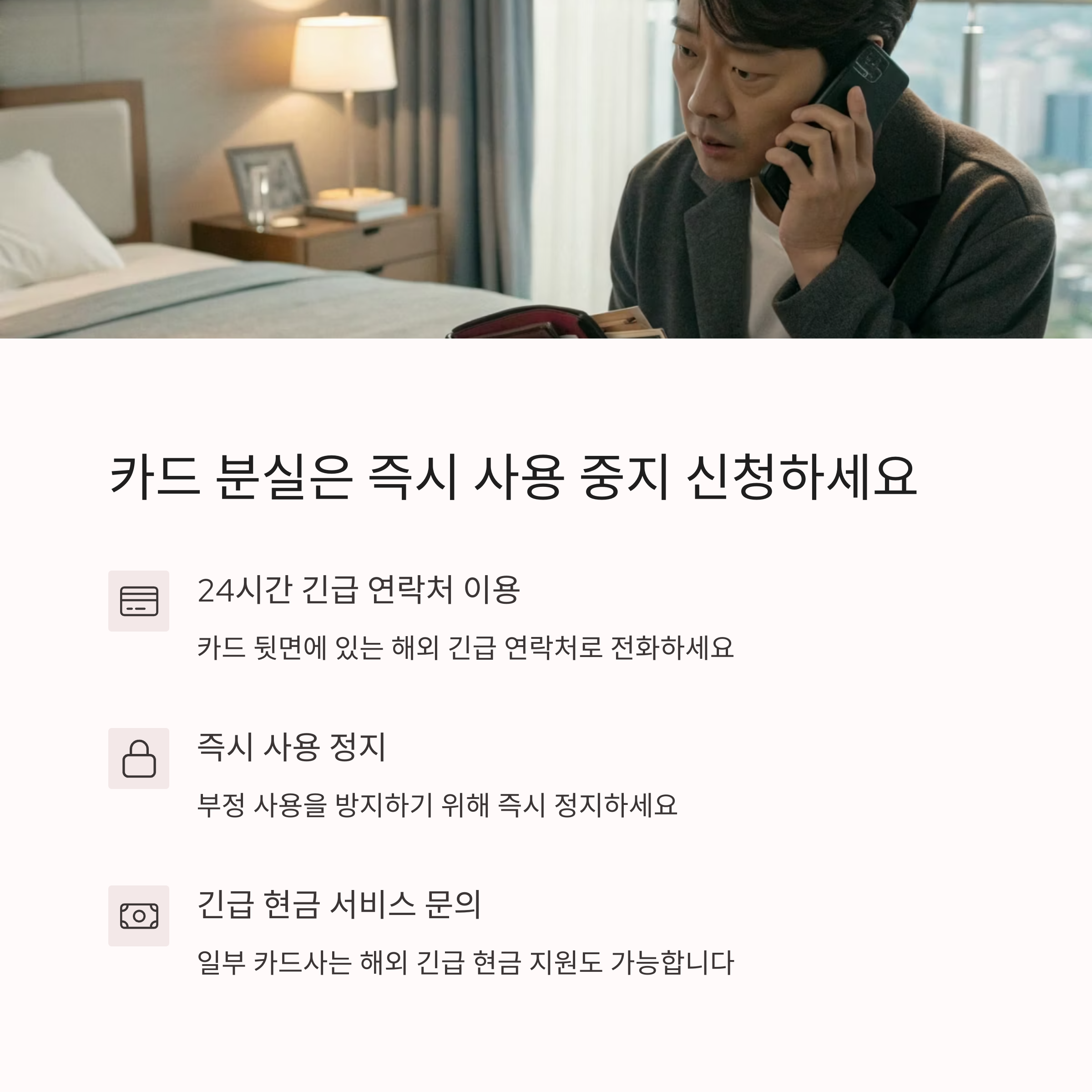 | 카드 분실 신고 | 비상 연락처 확보 | 보험 청구 준비 |