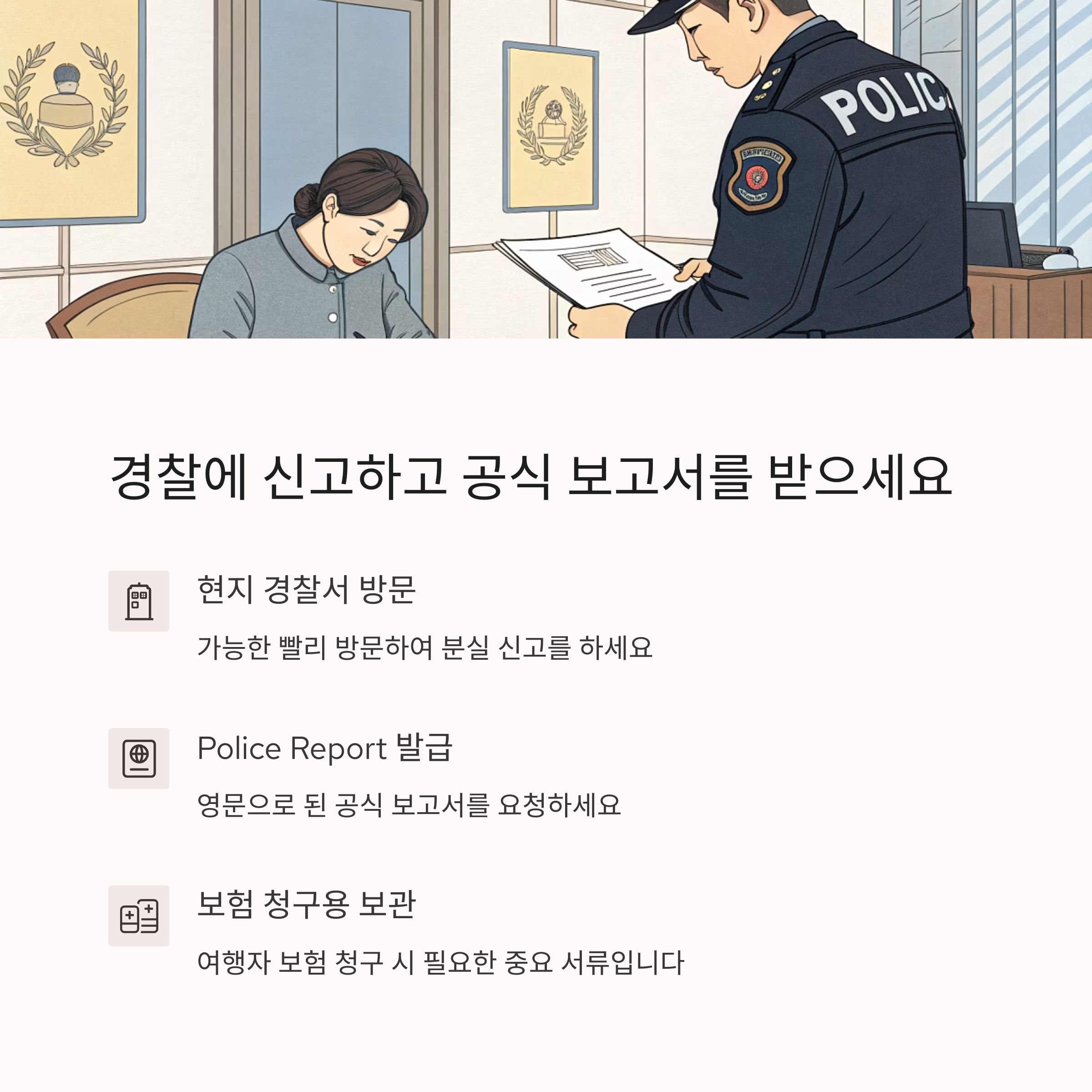 두 번째로, 경찰서에 신고를 접수해야 합니다. 현지 경찰서에 분실 신고를 하면 공식적인 서류(Police Report)를 받을 수 있습니다. 이 서류는 여행자 보험 청구나 대사관 여권 재발급 신청 시 필수로 제출해야 하는 중요한 문서입니다. 분실 장소, 시간, 내용 등을 최대한 자세히 기록해두세요. 언어가 불편하다면 통역 서비스를 요청할 수도 있습니다.