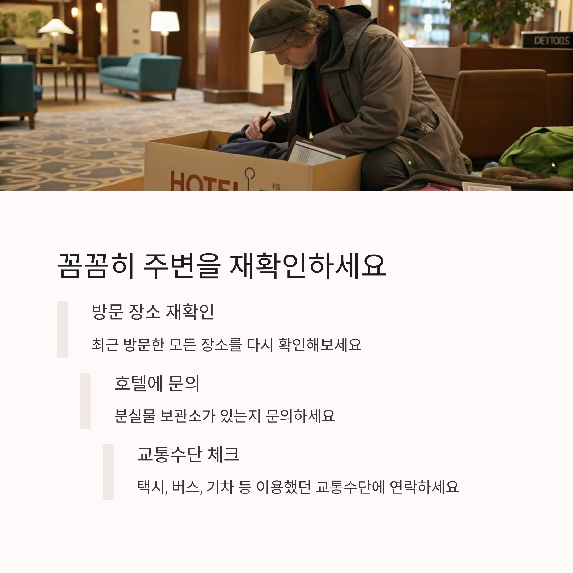 첫 번째로 해야 할 일은 침착함을 유지하는 것입니다. 분실 사실을 인지한 즉시 주변을 다시 한 번 확인하고, 이동 경로를 되짚어보세요. 분실 장소가 호텔, 레스토랑, 교통수단 내부 등이라면 즉시 직원이나 담당자에게 문의하여 도움을 요청할 수 있습니다. 분실 시간이 오래 지나지 않았다면 되찾을 가능성도 있습니다.