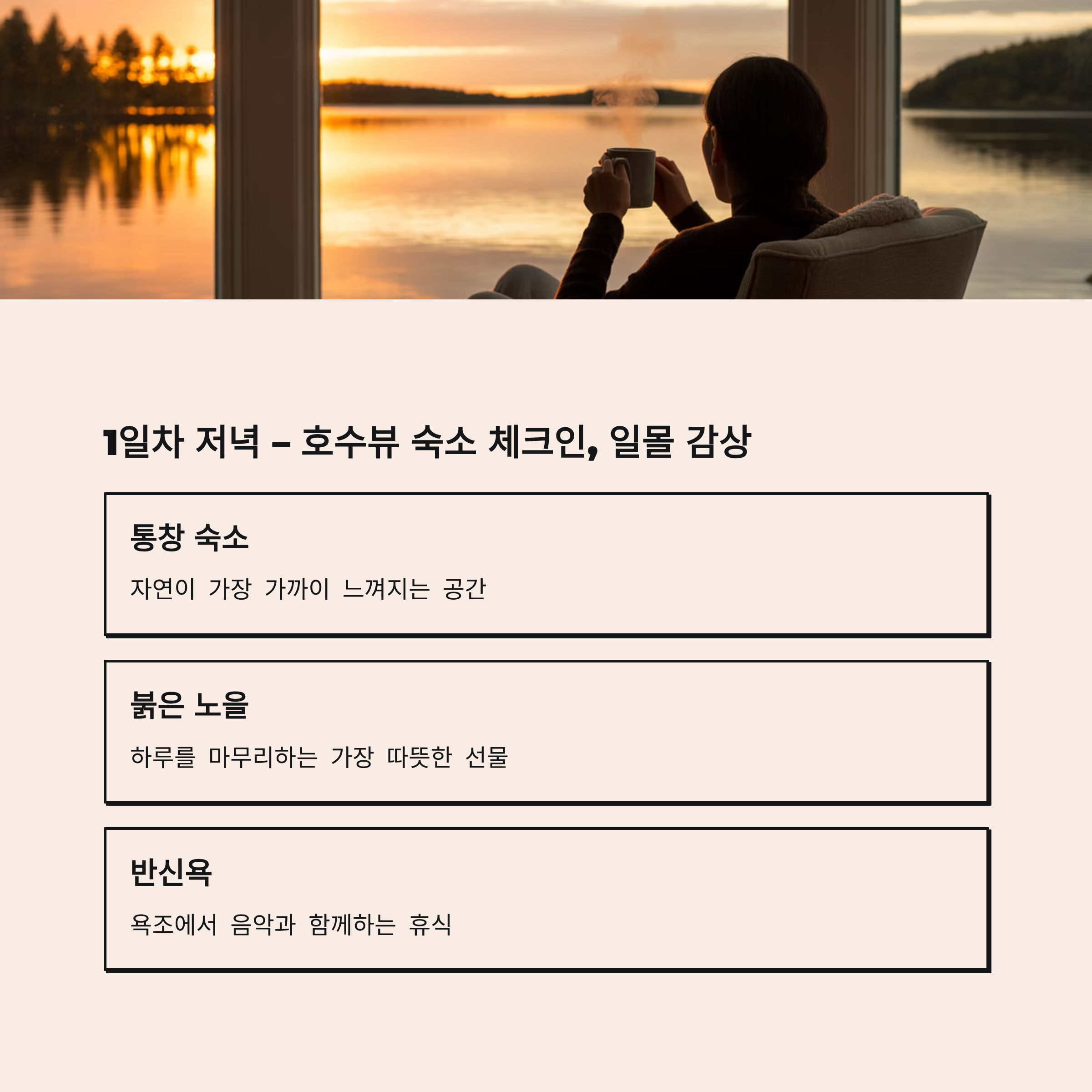 | 1일차 저녁 | 숙소 체크인 | 호수뷰, 통창, 욕조 |