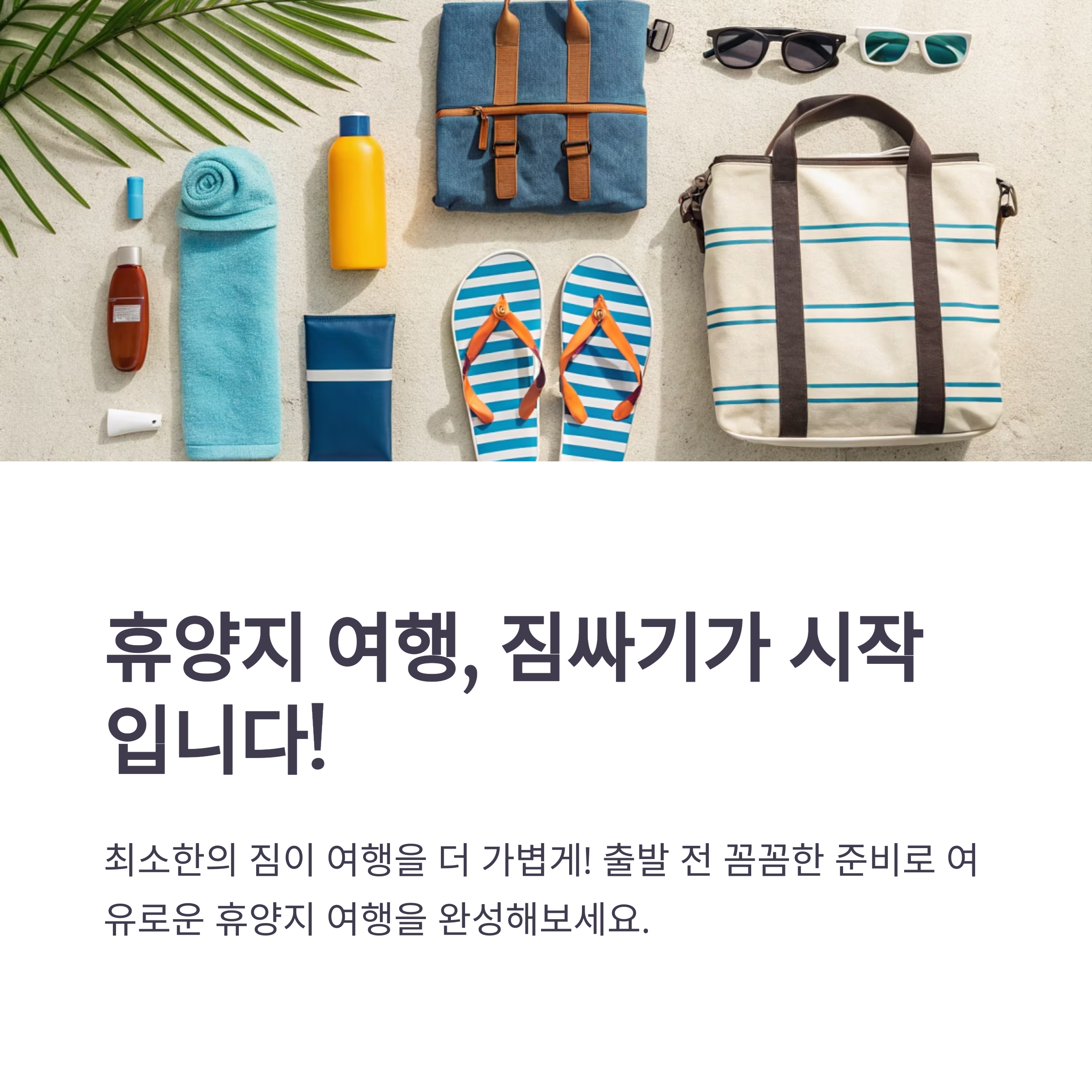 휴양지 여행의 시작은 짐싸기부터입니다. 가볍고 실용적으로 준비하면 여행 동안 더욱 여유롭고 편안한 시간을 보낼 수 있습니다. 꼭 필요한 것만 챙기고, 불필요한 짐은 과감히 덜어내세요. 짐을 줄이는 순간, 진짜 휴식이 시작됩니다.