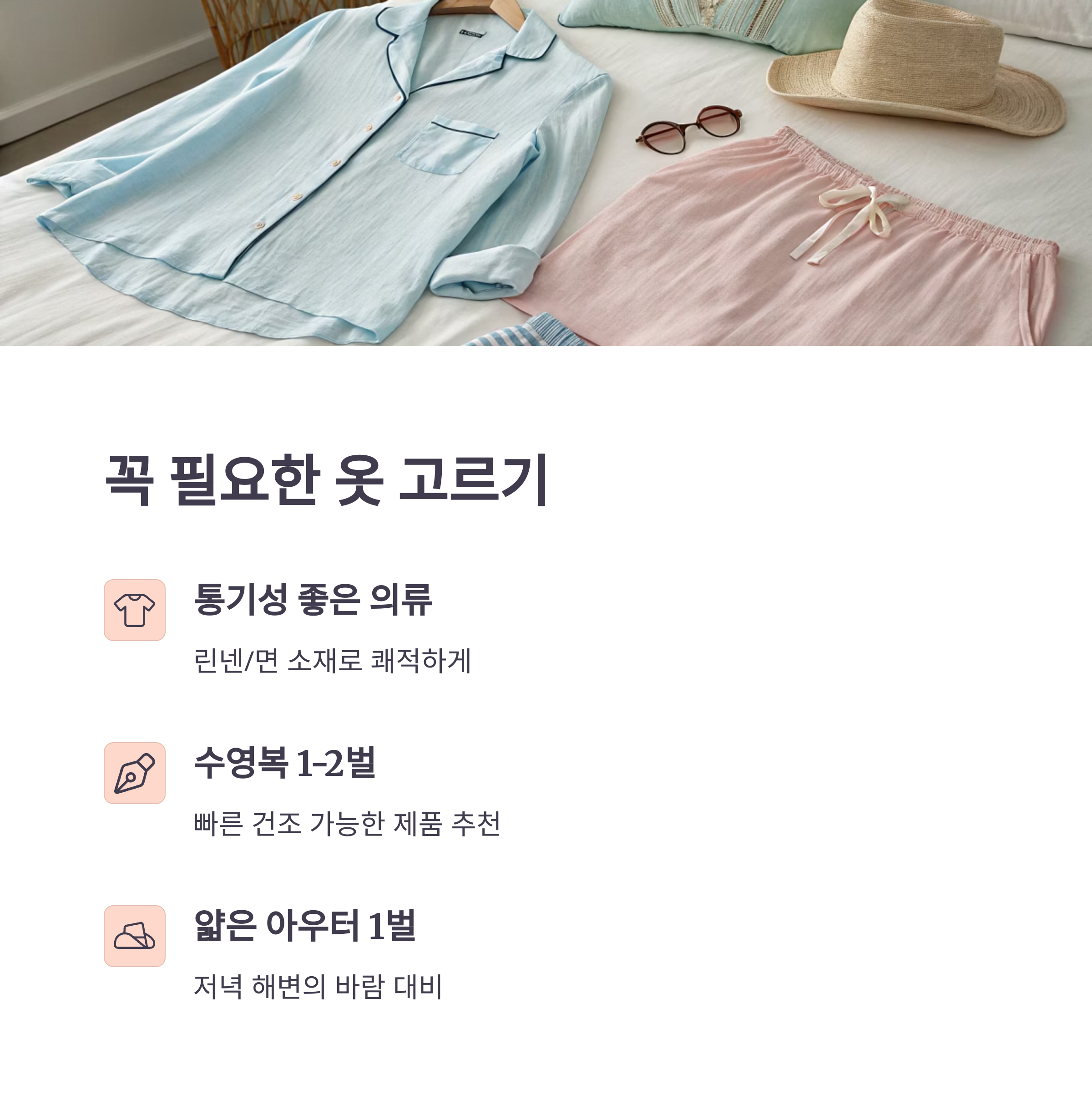 | 반팔, 린넨 셔츠, 수영복 | 자외선 차단제, 선글라스, 모자 | 구급약, 손세정제, 충전기 |
