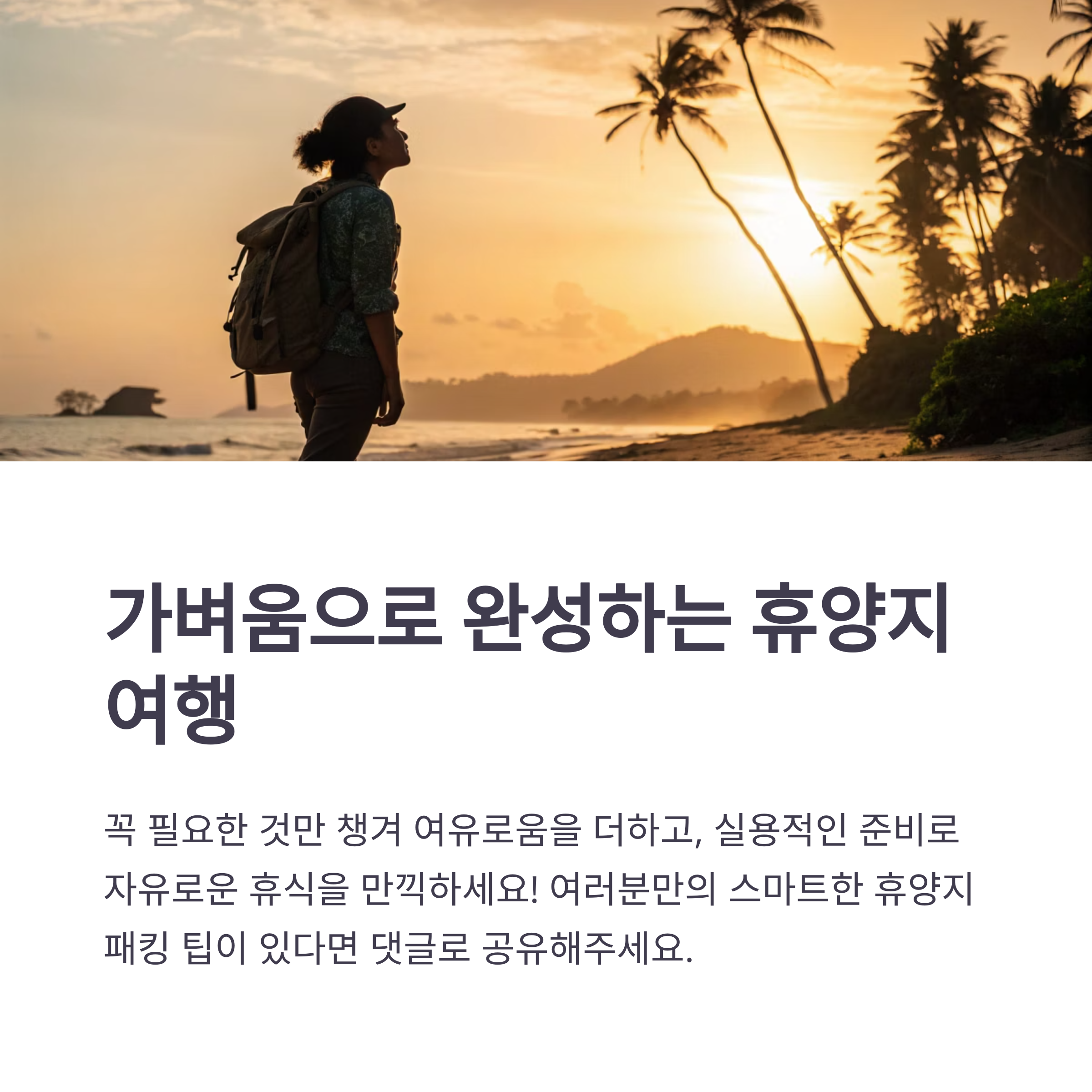 여행 전 꼭 챙기는 아이템이나 나만의 팁을 댓글로 공유해 주세요! 함께 스마트한 휴양지 여행을 준비해봐요.