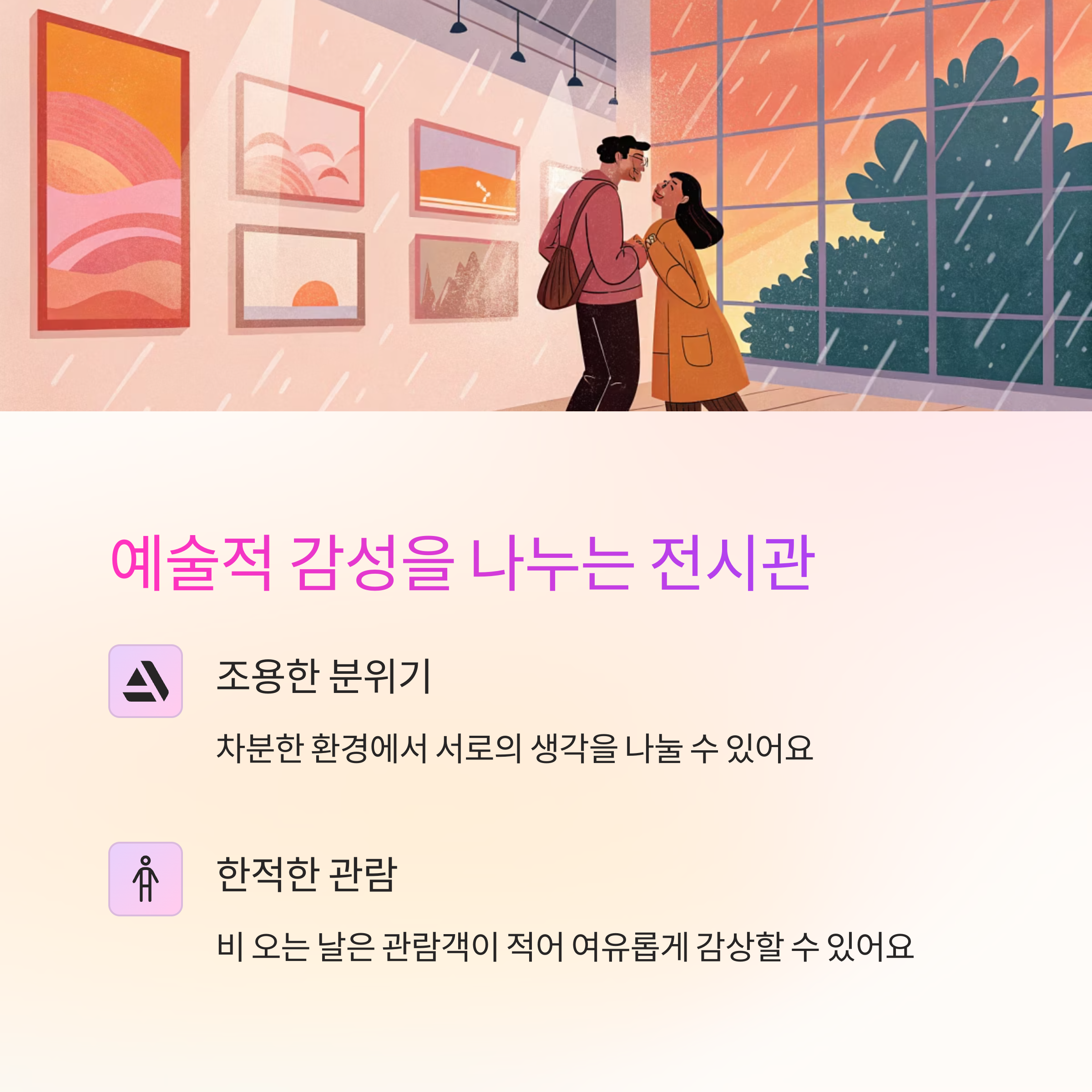 예술 작품을 감상하며 대화를 나눌 수 있는 전시관이나 미술관은 비 오는 날 데이트 장소로 추천할 만합니다.