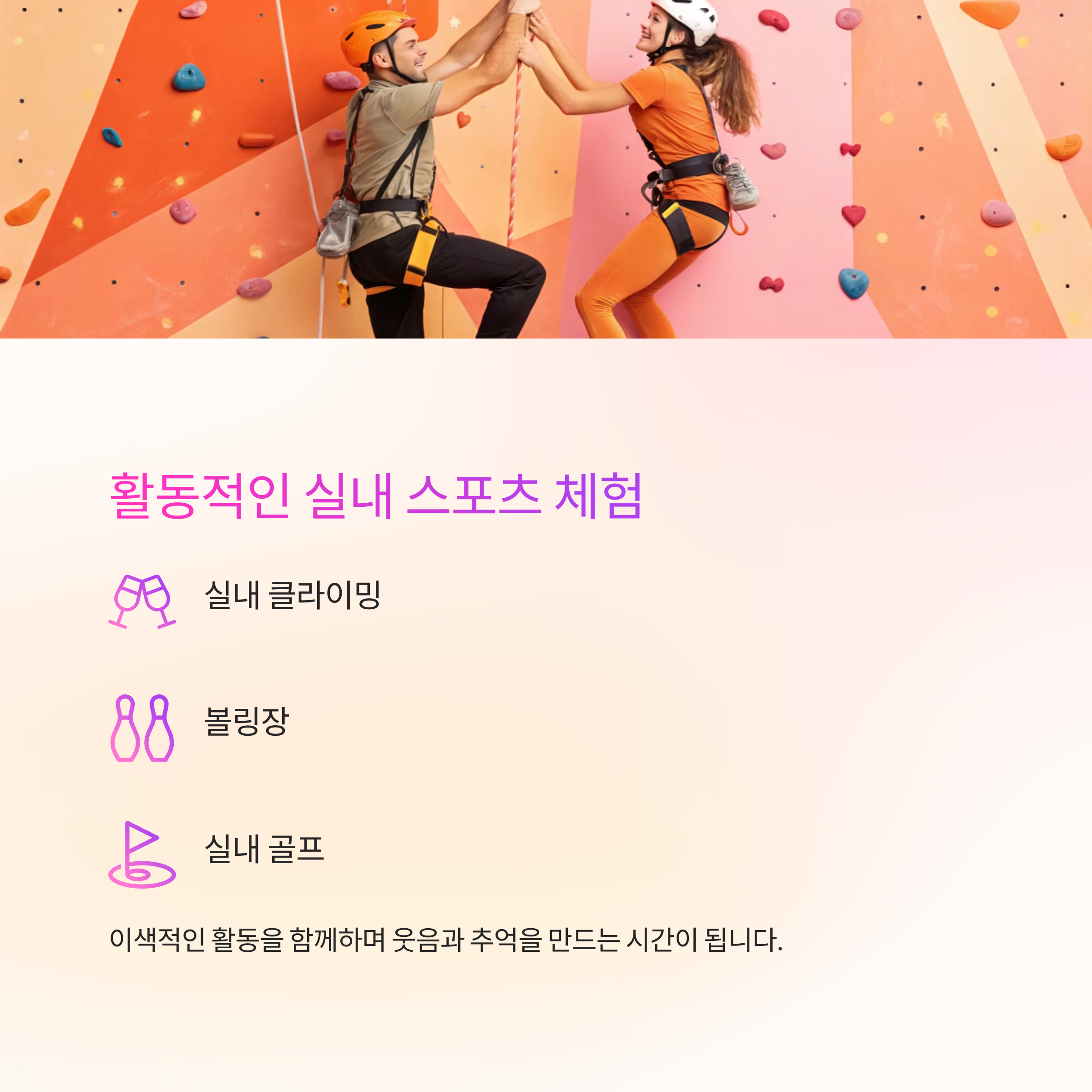 실내 클라이밍, 볼링장, 실내 골프 연습장 등 다양한 스포츠 시설에서 색다른 경험을 즐길 수 있습니다.