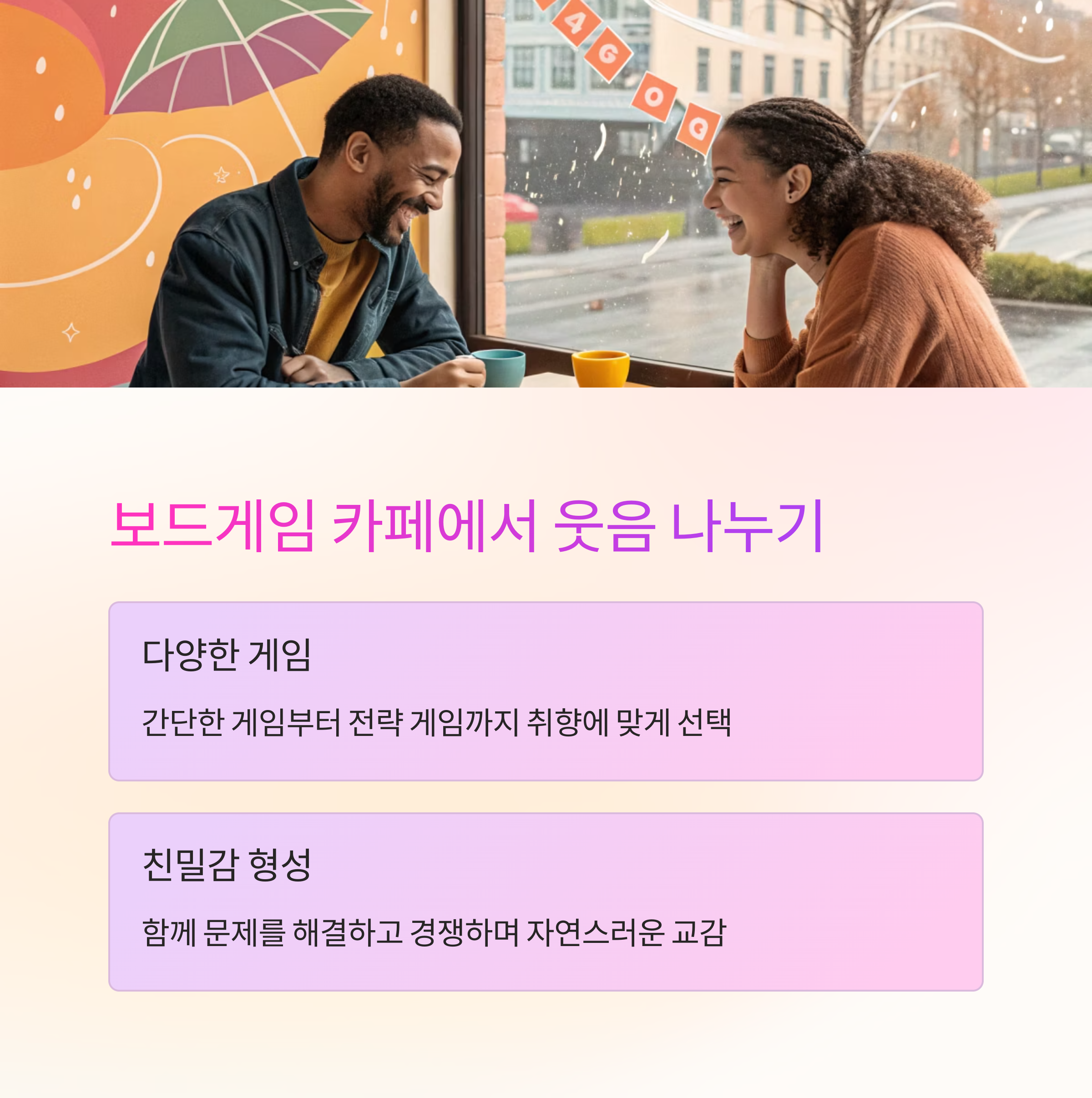 비 오는 날에는 보드게임 카페에서 다양한 게임을 즐기며 웃음을 나누는 것도 좋은 데이트가 됩니다.