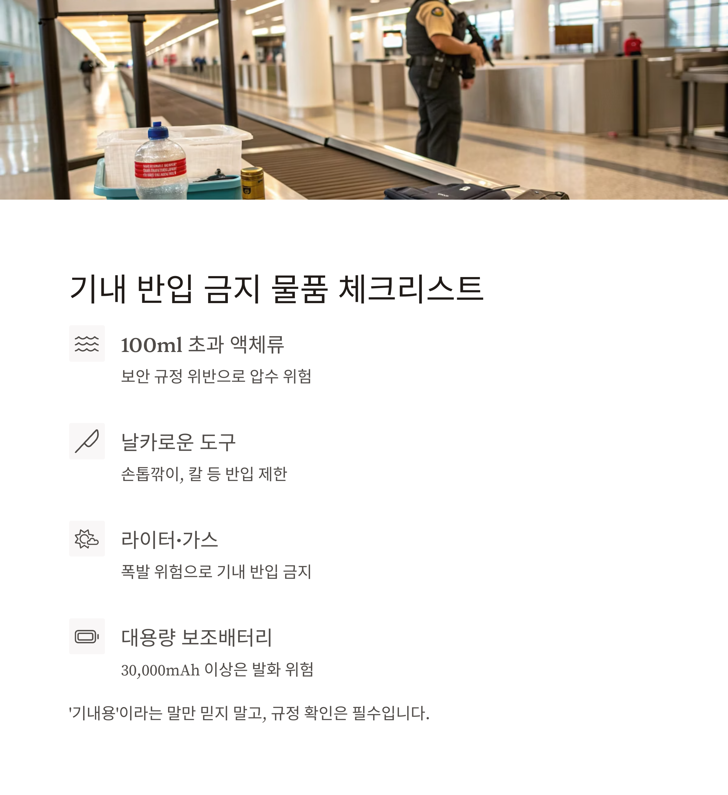 날카로운 물건, 배터리 용량이 높은 전자기기 등은 제한되니 미리 확인이 필수입니다.