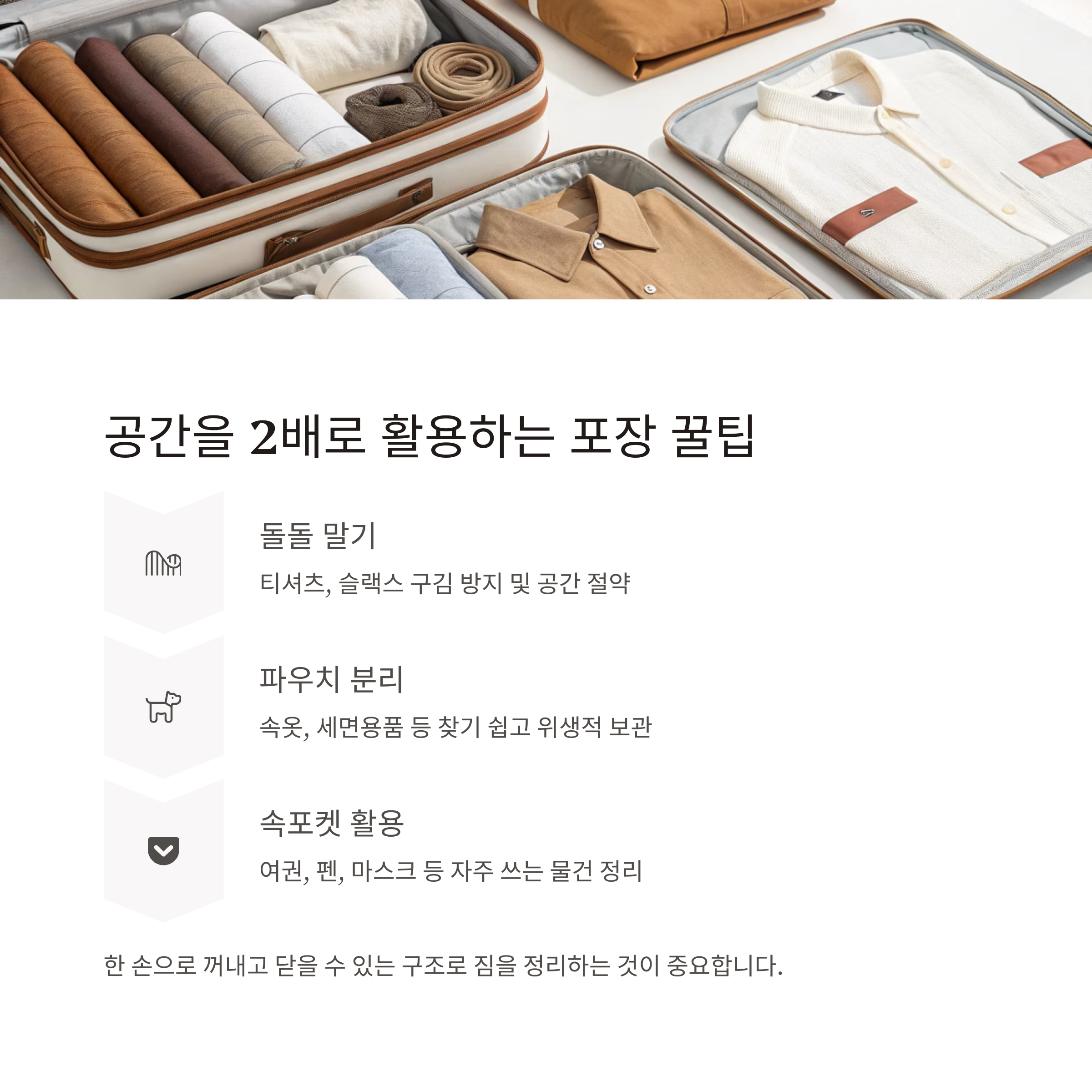"돌돌 말기", "주머니 단위 정리", "겹치기 정리" 같은 기법이 유용합니다.