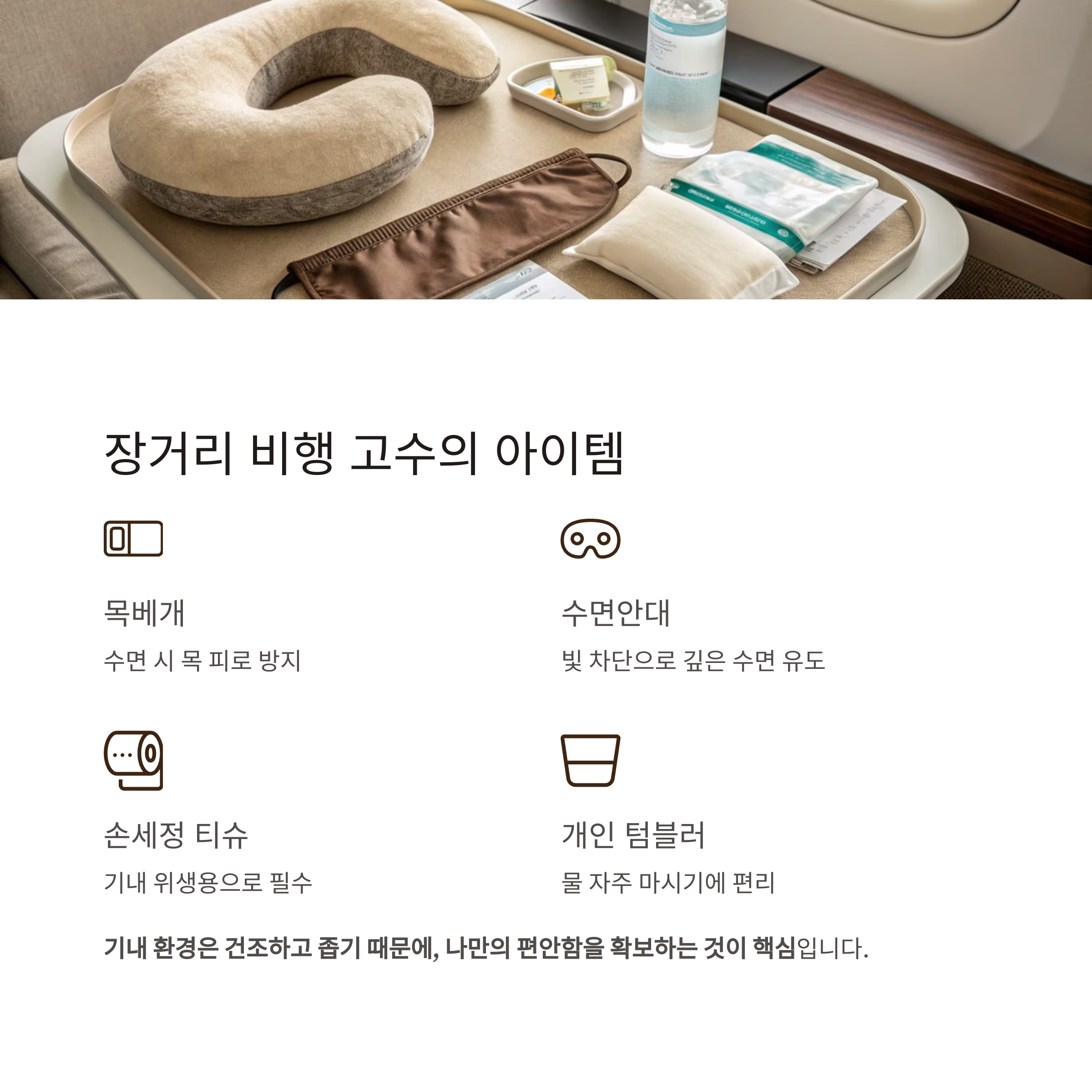 기내 환경은 건조하고 좁기 때문에, 나만의 편안함을 확보하는 것이 핵심입니다.