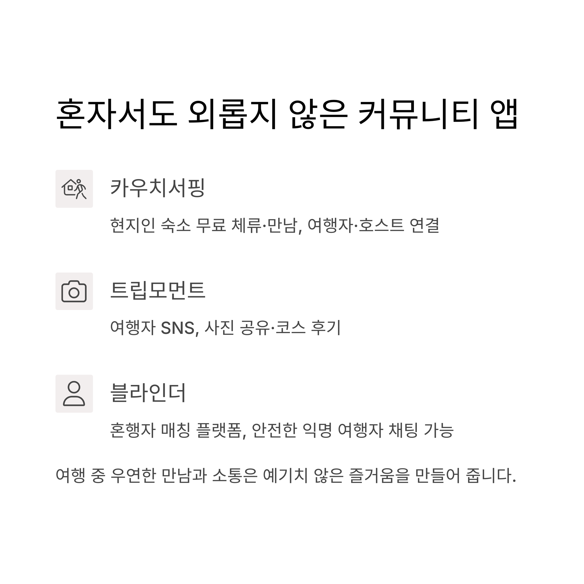 혼자서도 외롭지 않은 커뮤니티형 여행 앱