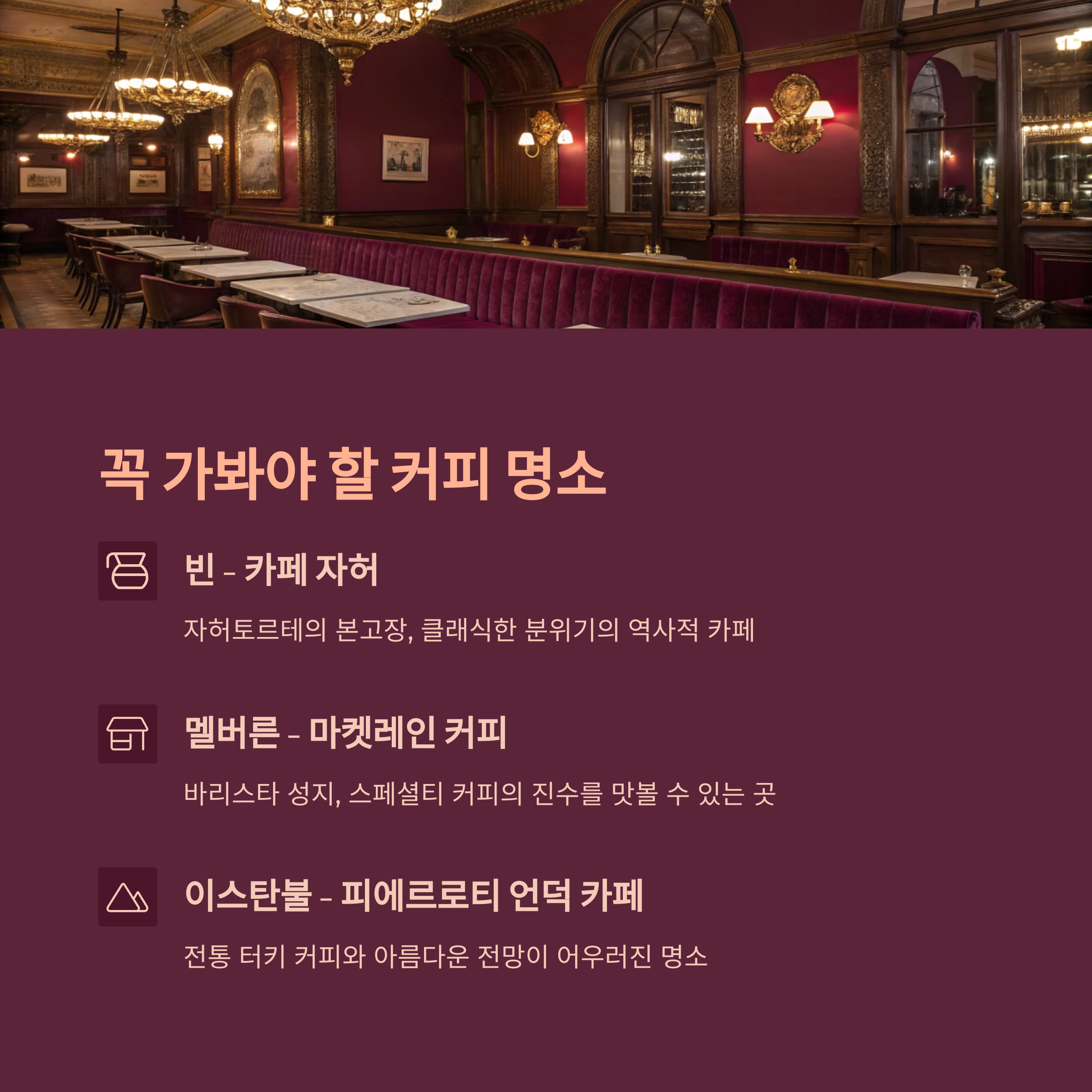 이 도시는 그 나라의 커피 정체성을 대표하는 장소이자, 커피 한 잔으로 도시를 경험할 수 있는 곳들입니다.