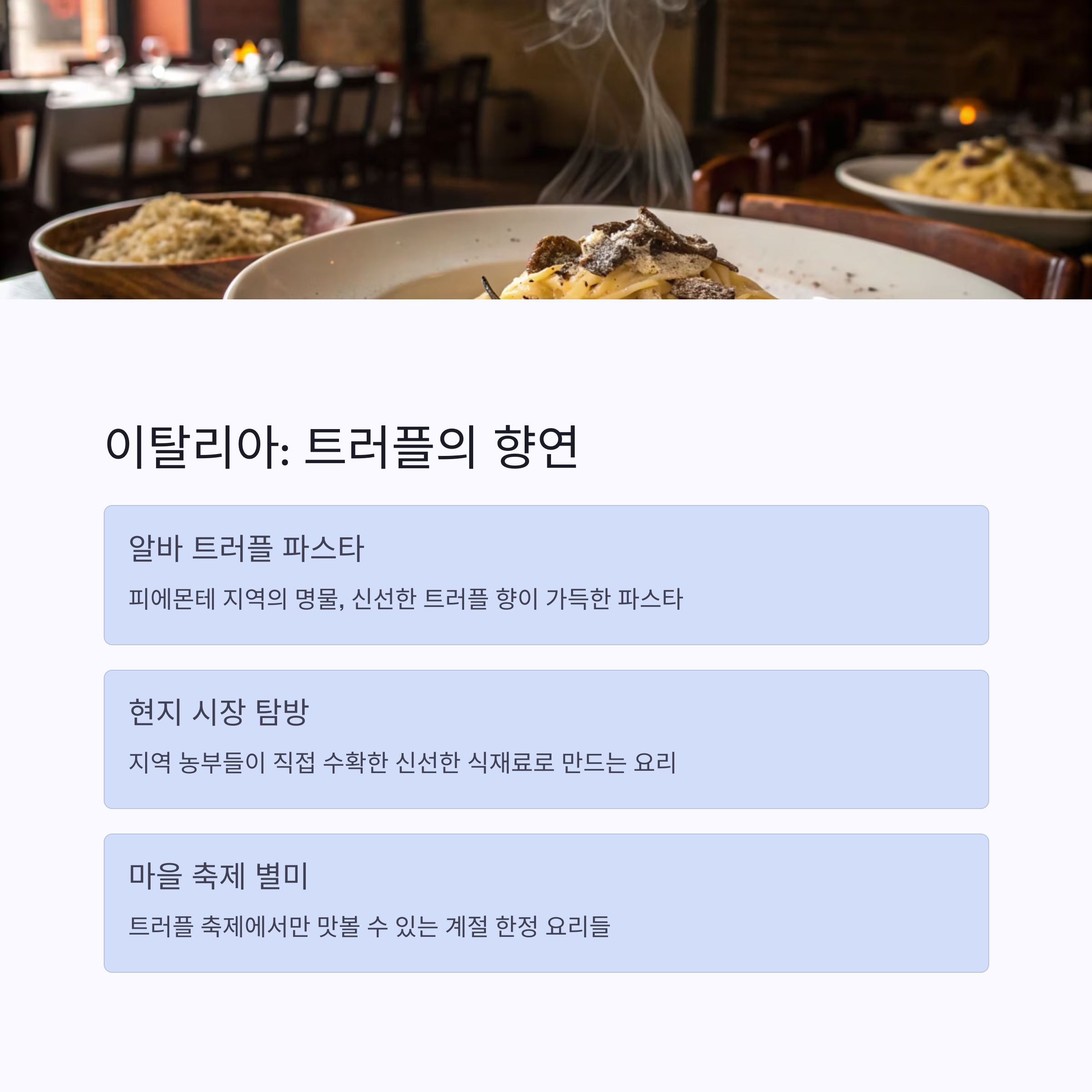 | 트러플 파스타, 리조또 | 골목길 숨은 맛집 | 신선한 해산물 요리 |