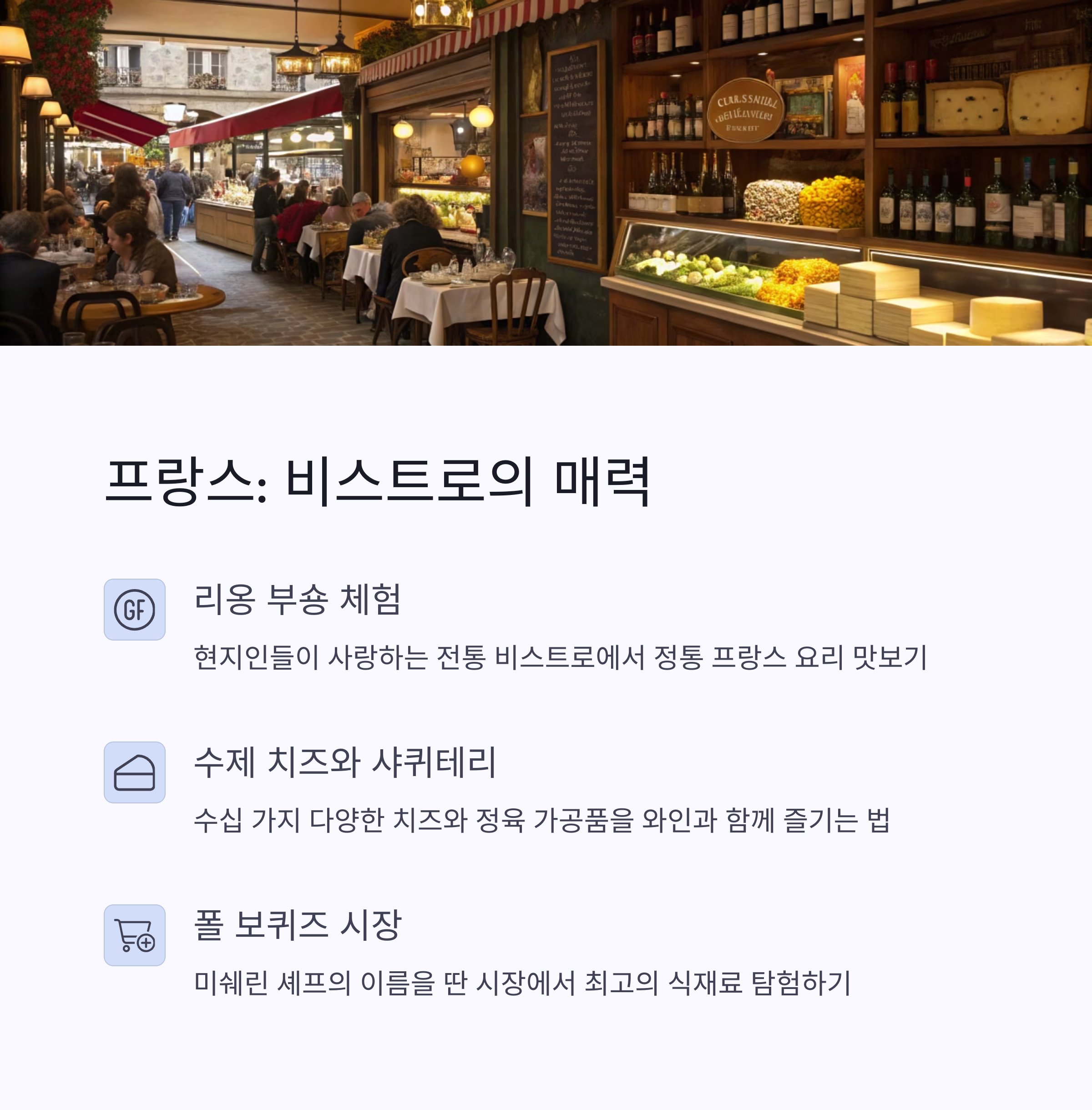 | 이탈리아 미식 | 프랑스 비스트로 | 스페인 타파스 |