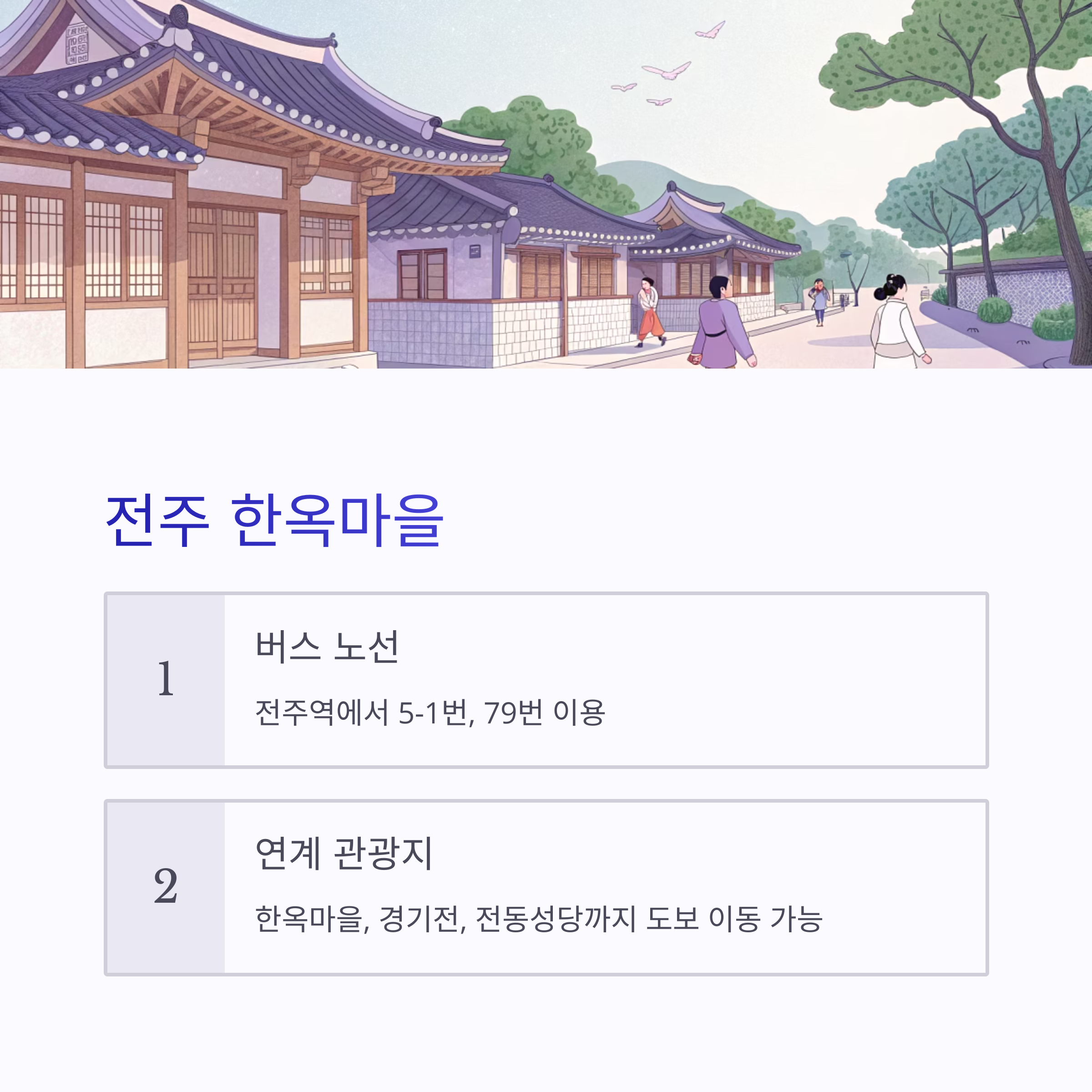 | 전주 | 한옥마을 | 5-1, 79번 | 전주역 |