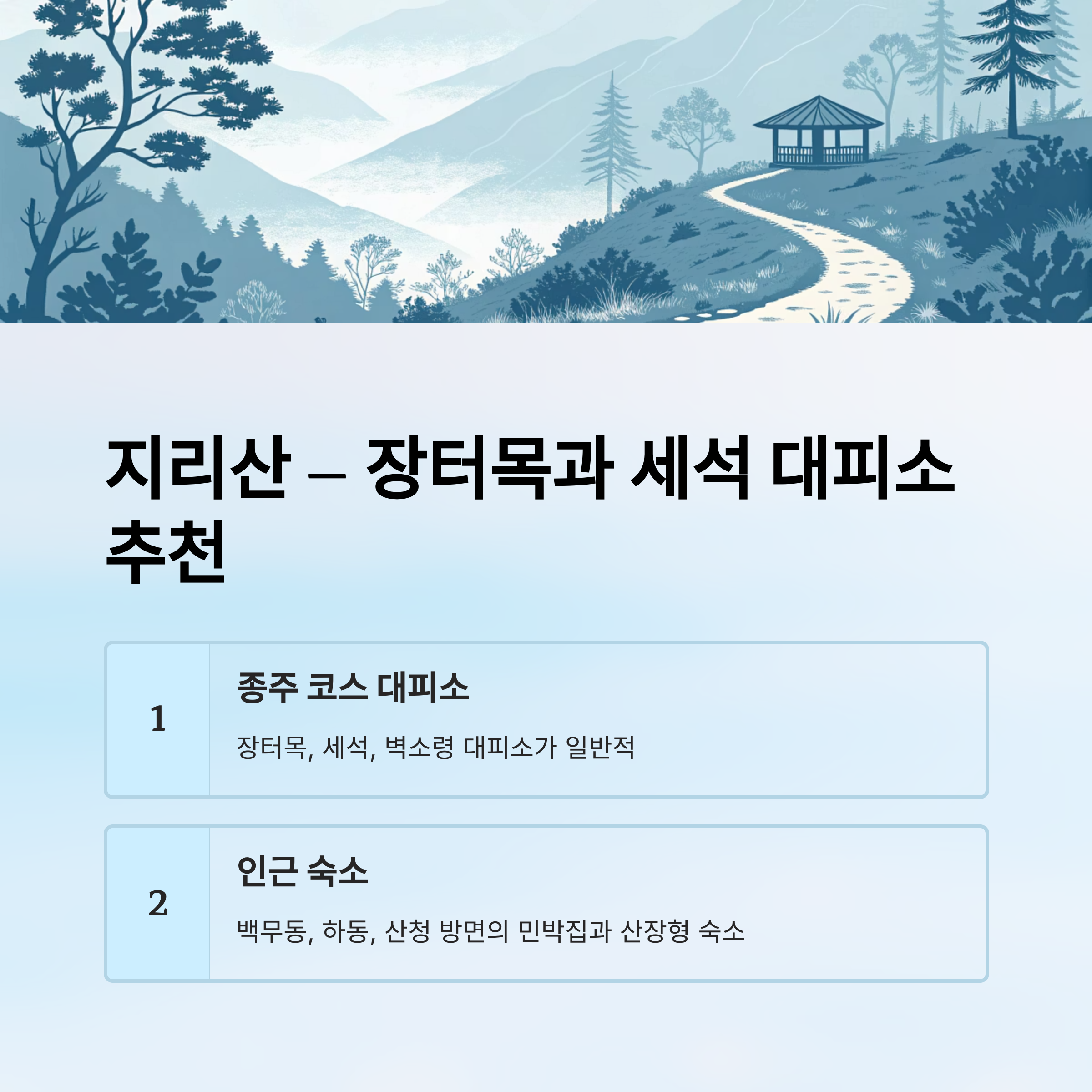 | 지리산 | 대피소, 산장 | 종주 계획 시 루트별 미리 예약 필수 |