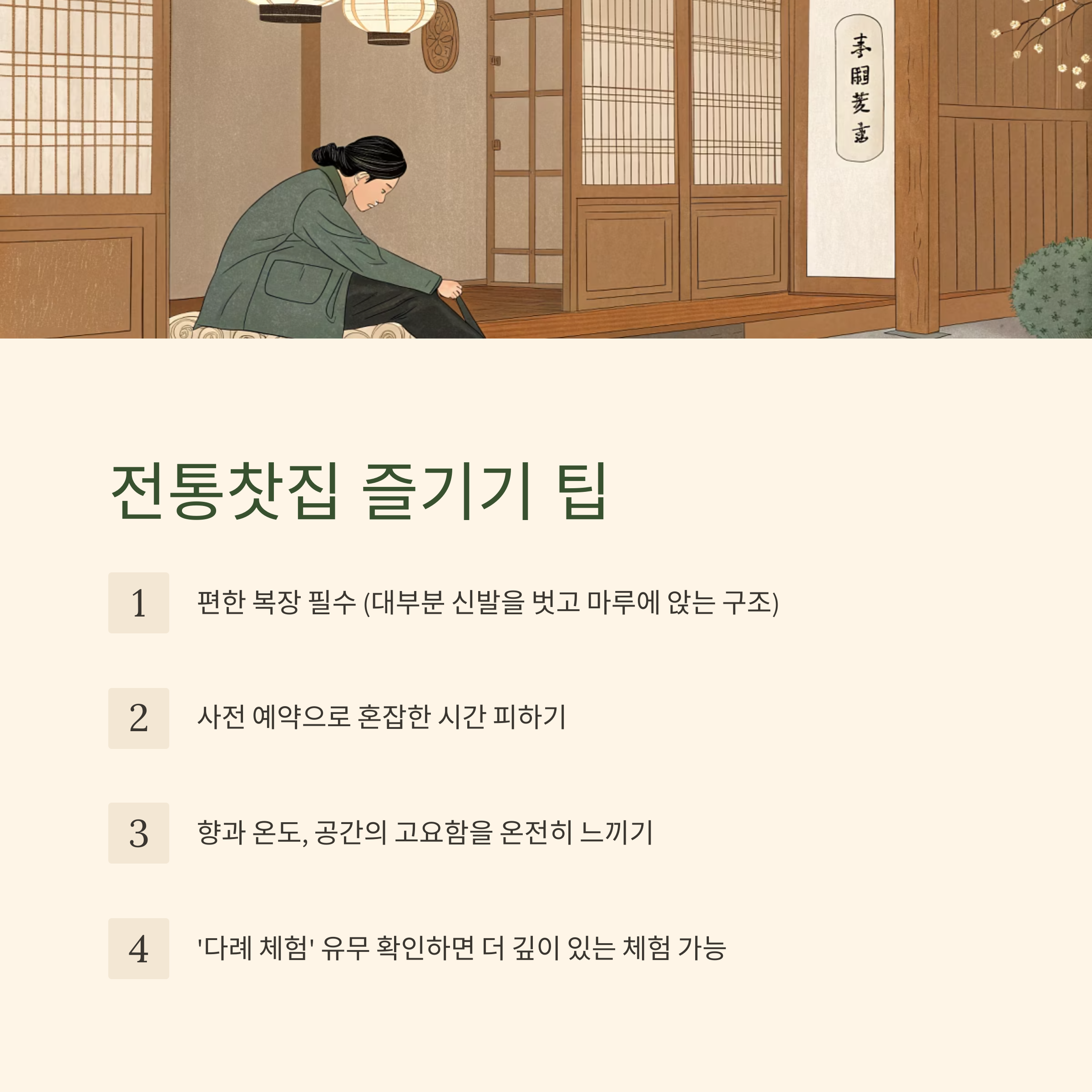 - 각 찻집마다 ‘다례 체험’ 유무 확인하면 더 깊이 있는 체험도 가능