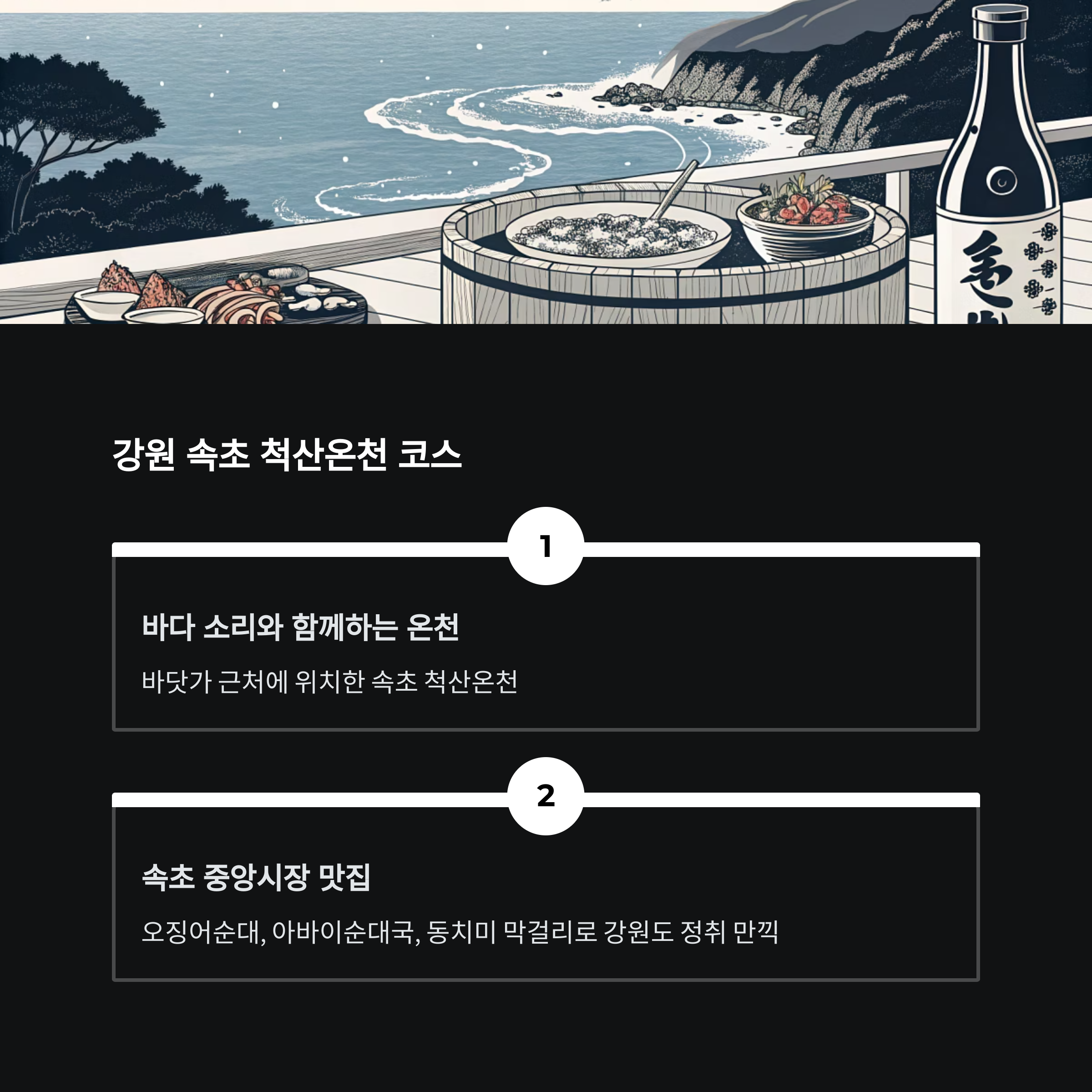 | 속초 | 척산온천 | 오징어순대, 막걸리 | 중앙시장, 아바이마을 인접 |