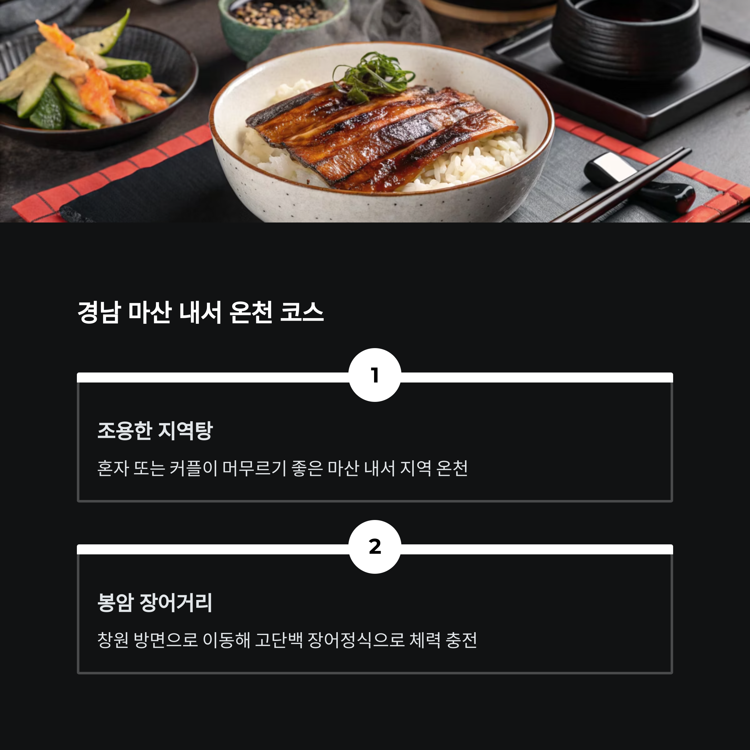 추천 코스: 내서온천탕 → 창원 봉암장어거리 → 장어정식