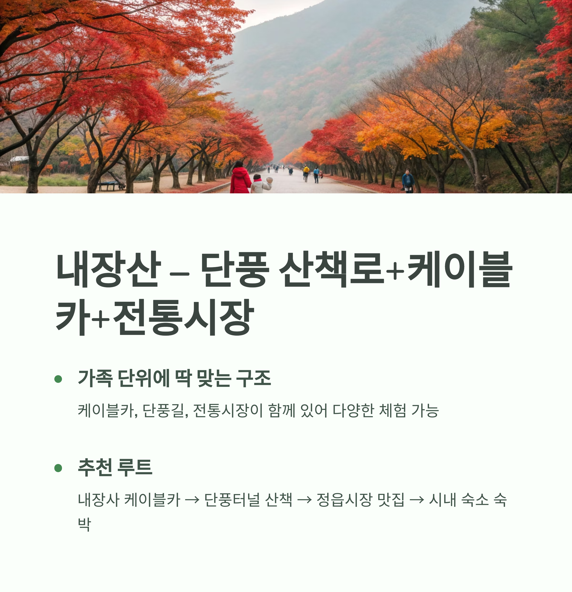 | 내장산 | 케이블카+단풍길+전통시장 | 시내 숙소 | 사계절 테마 + 맛집 투어 |