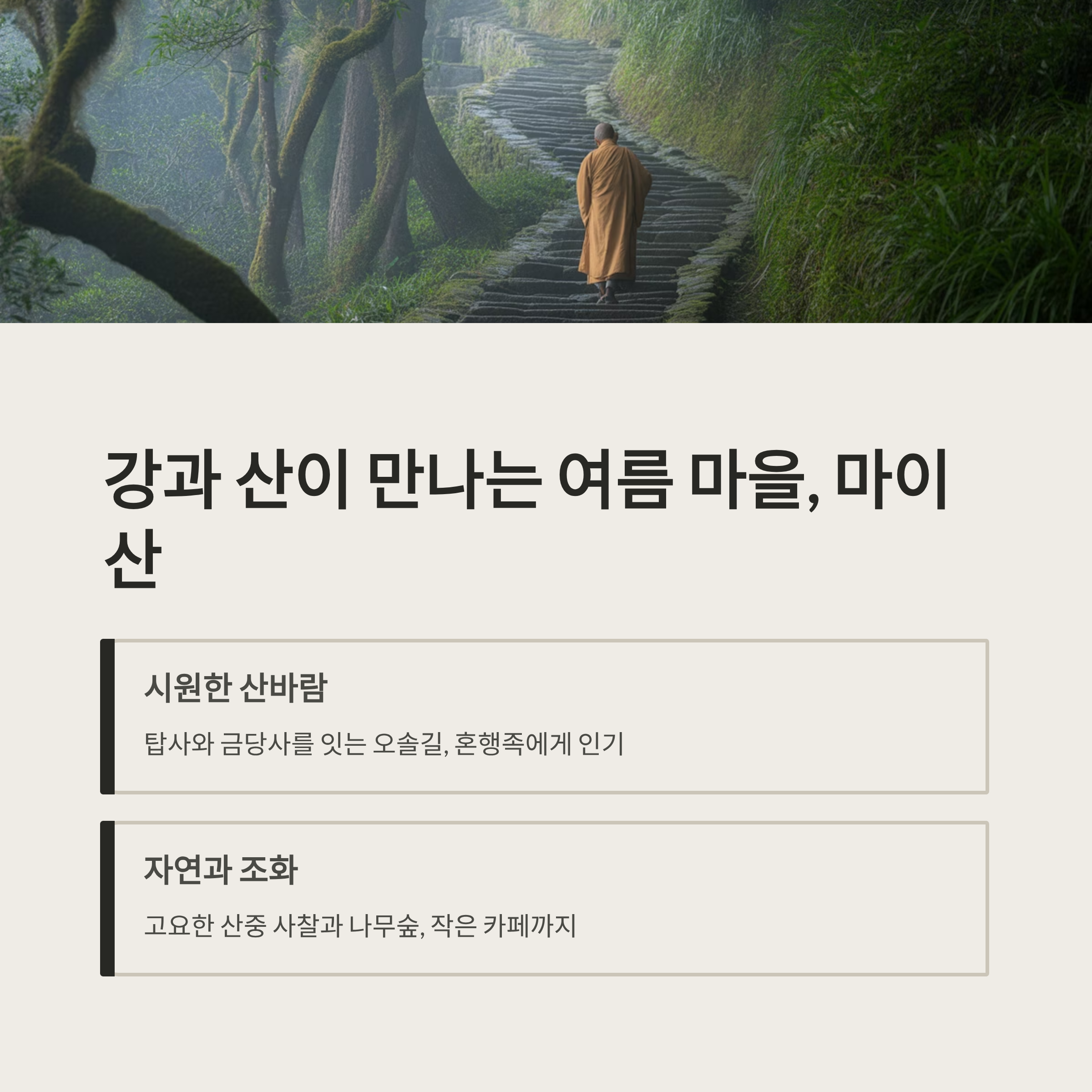 고요한 산중 사찰과 나무숲, 그리고 작은 카페까지