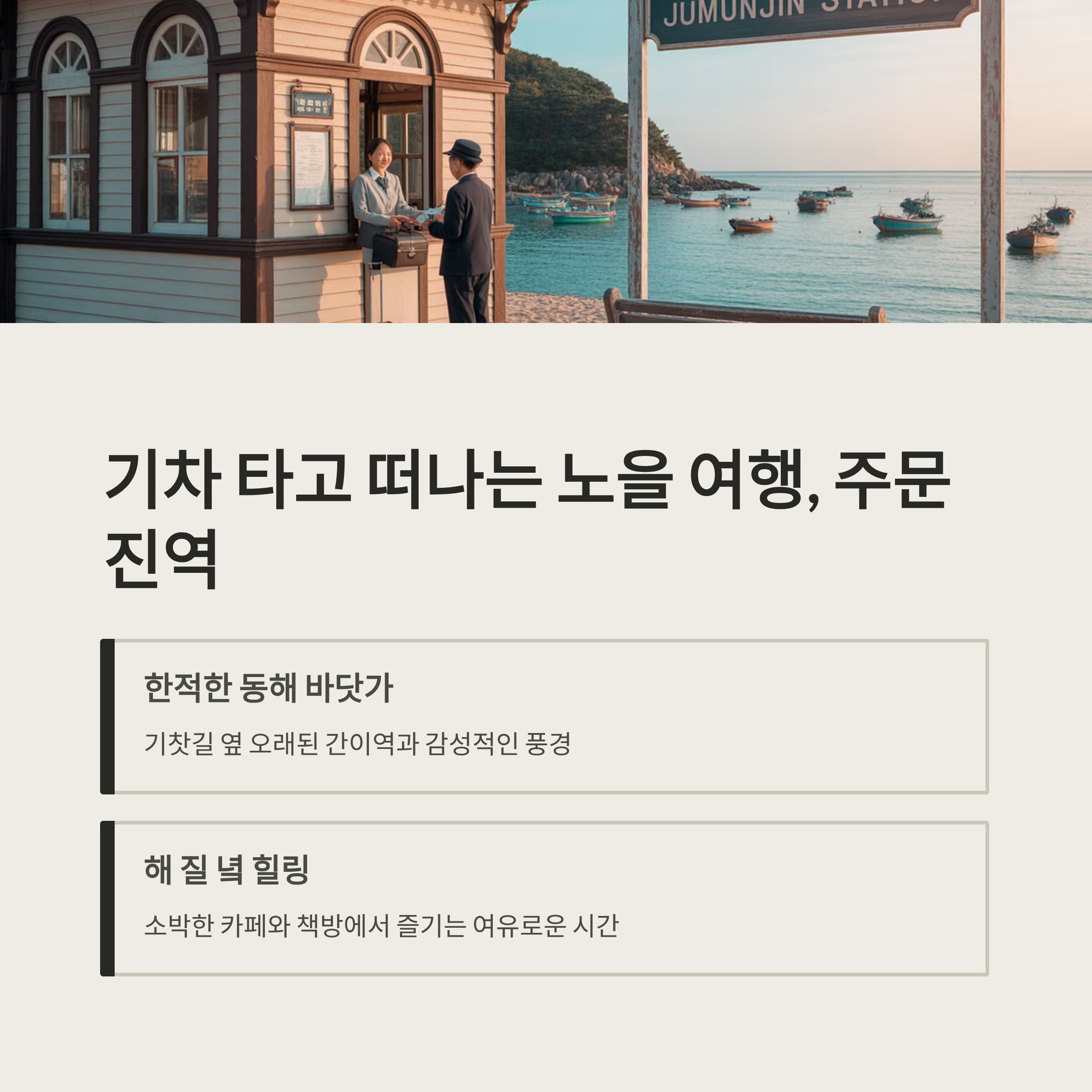 한적한 동해 바닷가, 기찻길 옆 오래된 간이역.