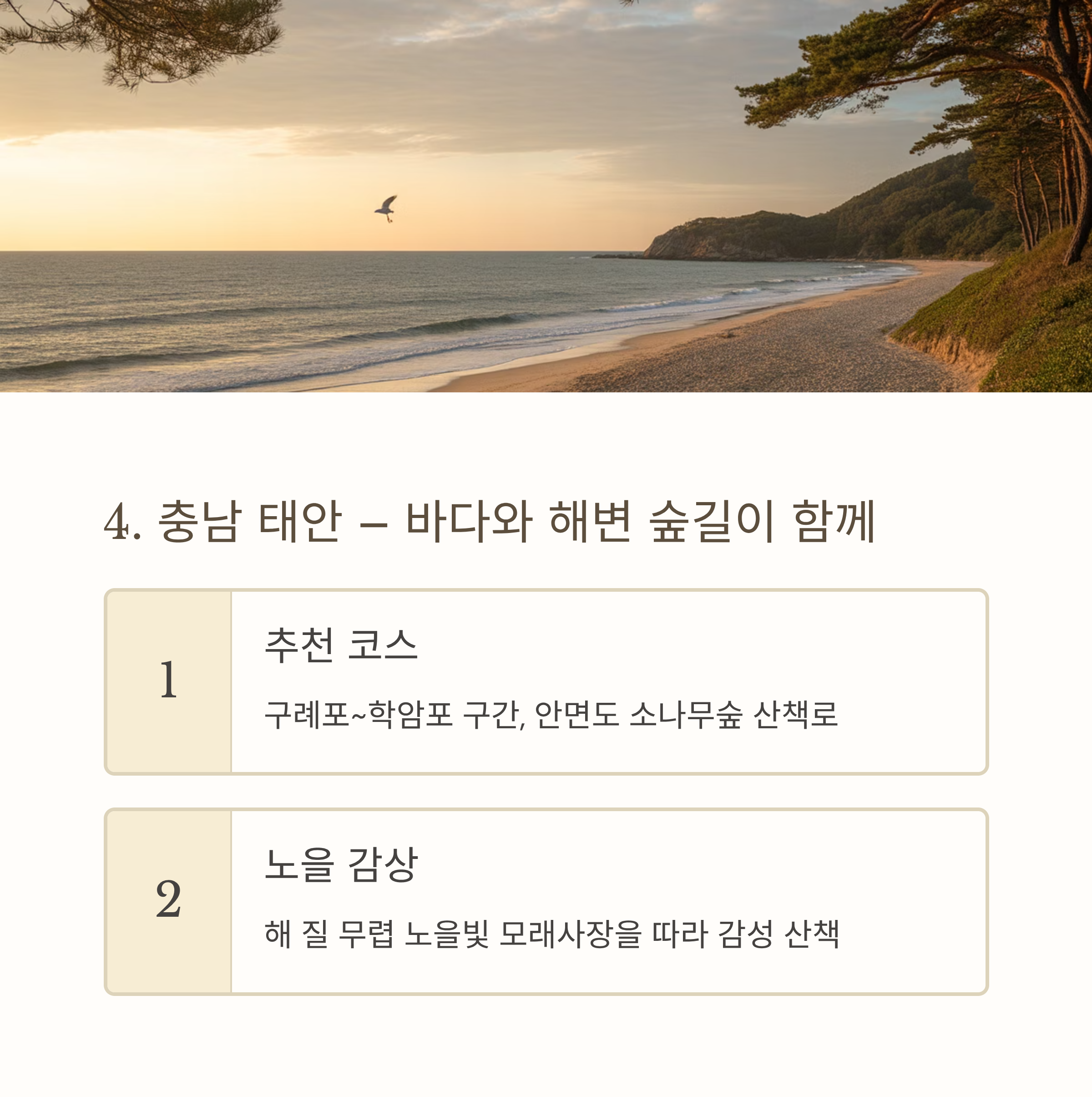 | 태안 | 해변, 소나무숲 | 바다+산책, 감성 산책로 |