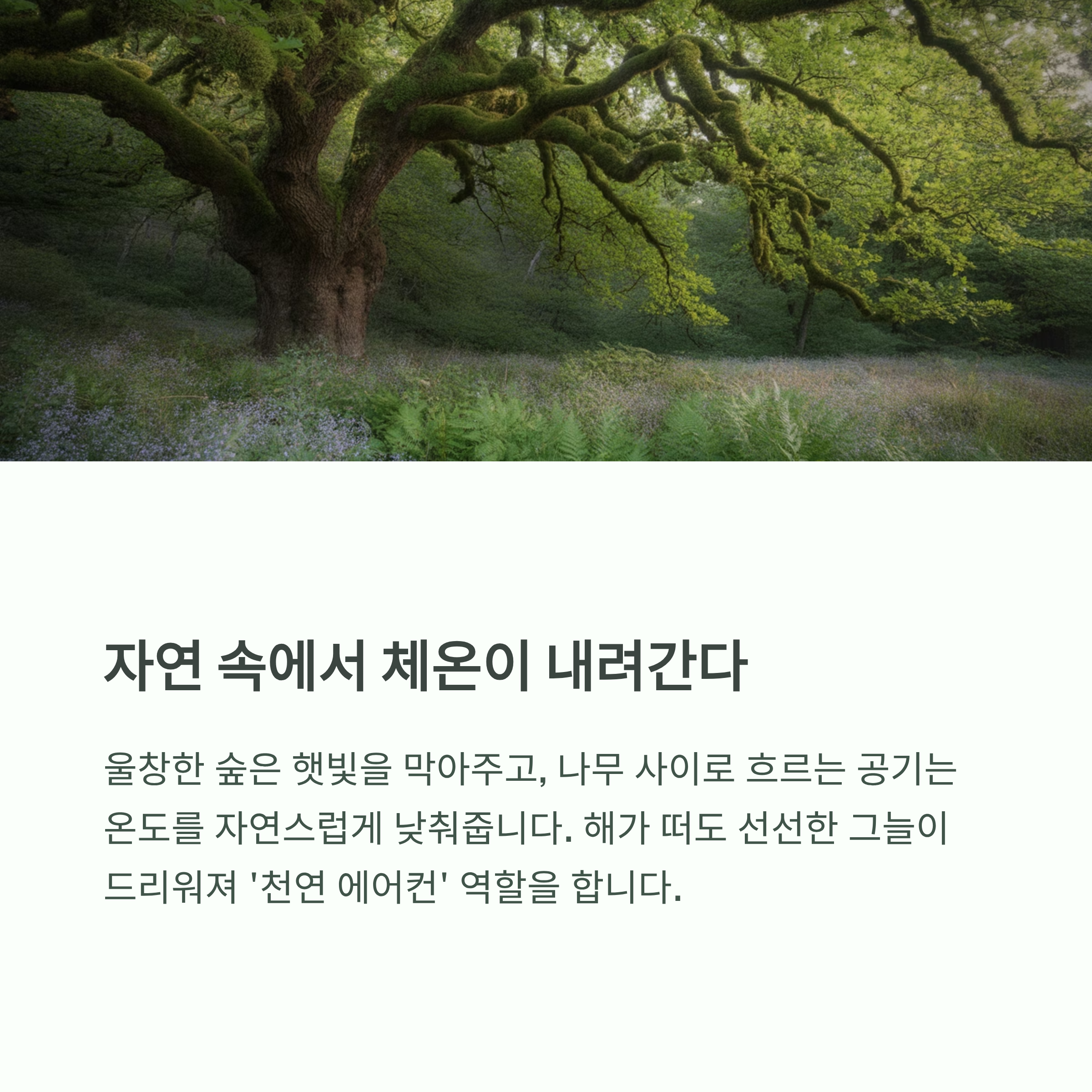나무 사이로 흐르는 공기는 온도를 자연스럽게 낮춰줍니다.