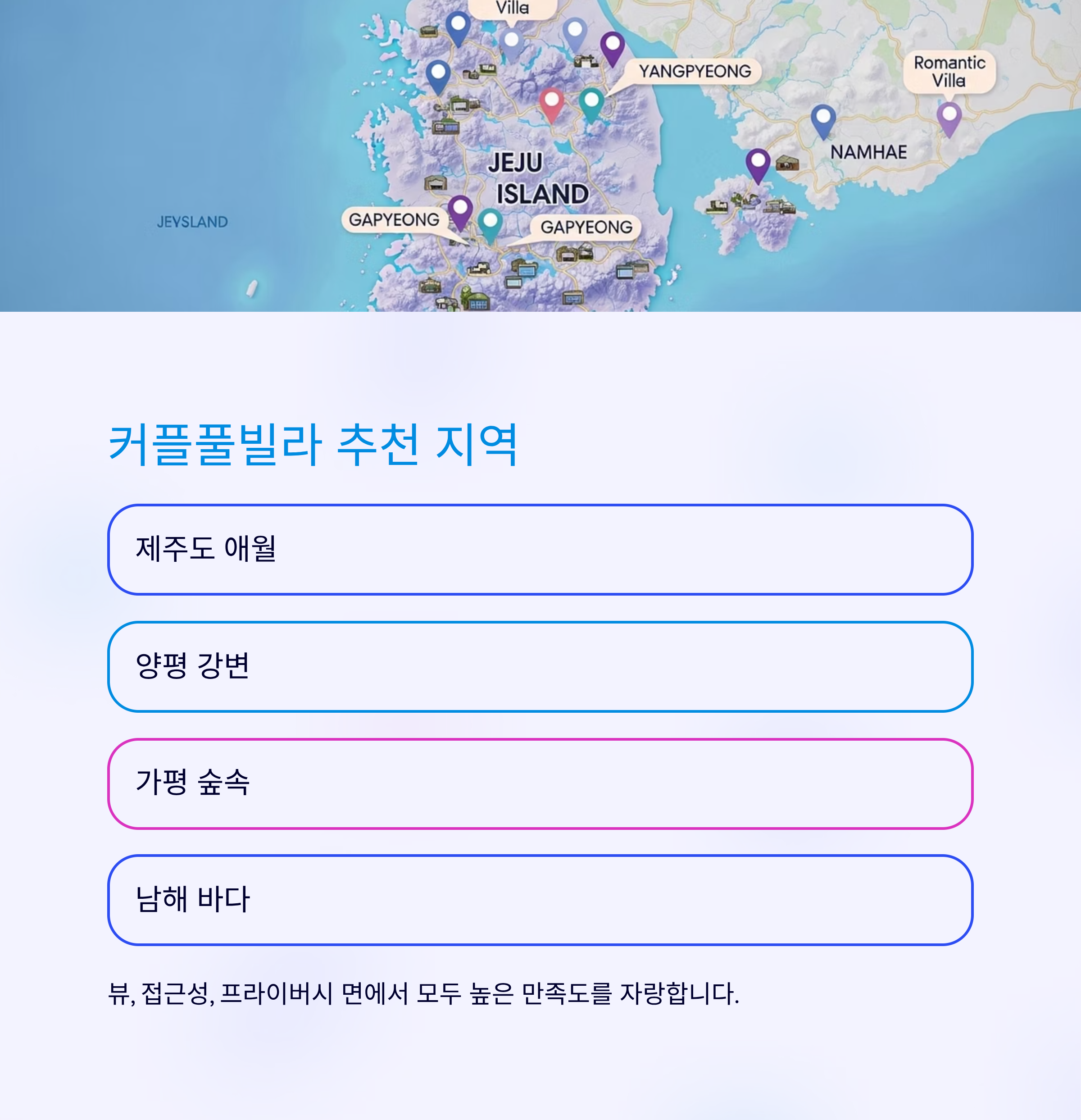 제주도 애월, 양평 강변, 가평 숲속, 남해 바다 인근 등은