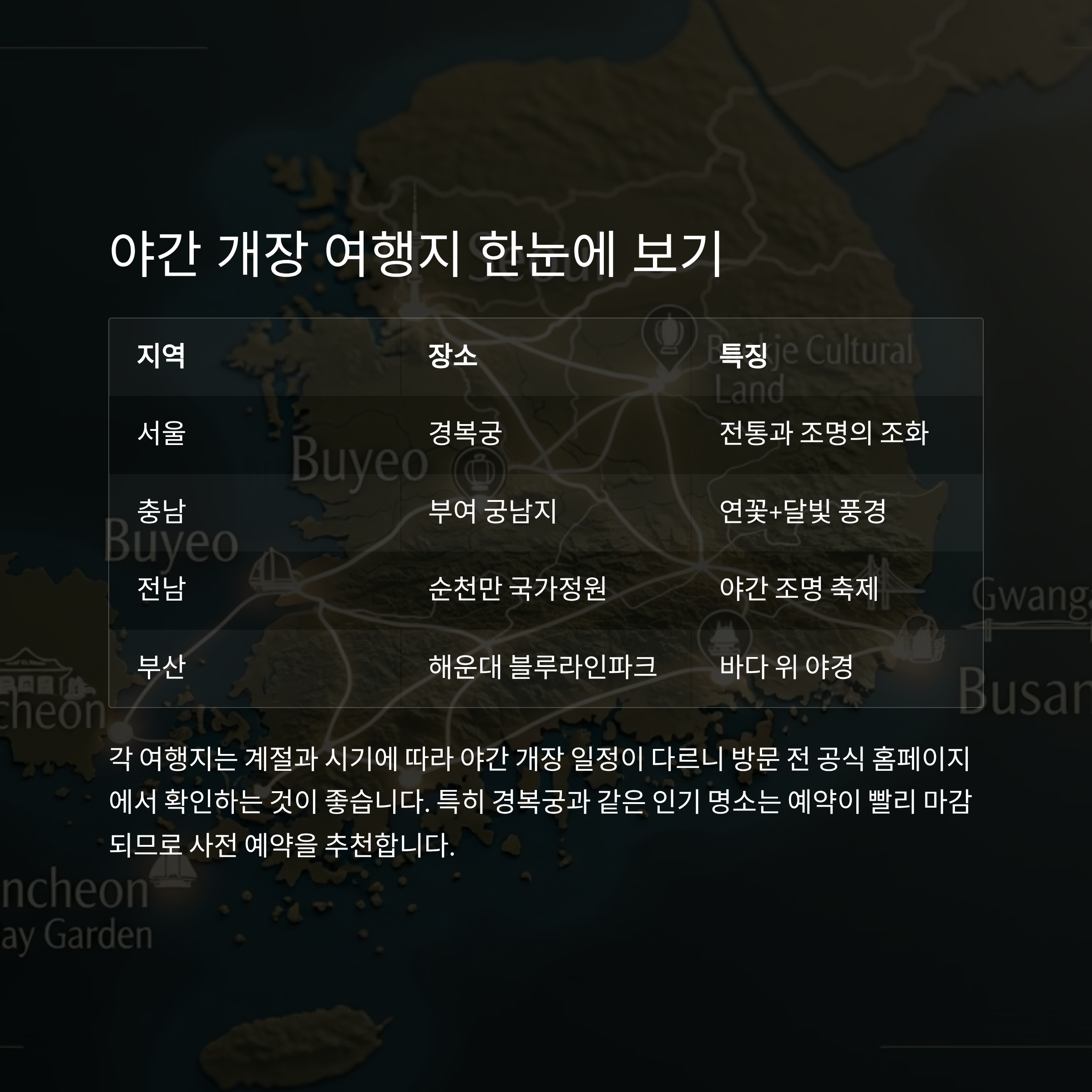 #야간개장 #야경여행지 #경복궁야간개장 #순천만국가정원 #부여궁남지 #해운대블루라인파크