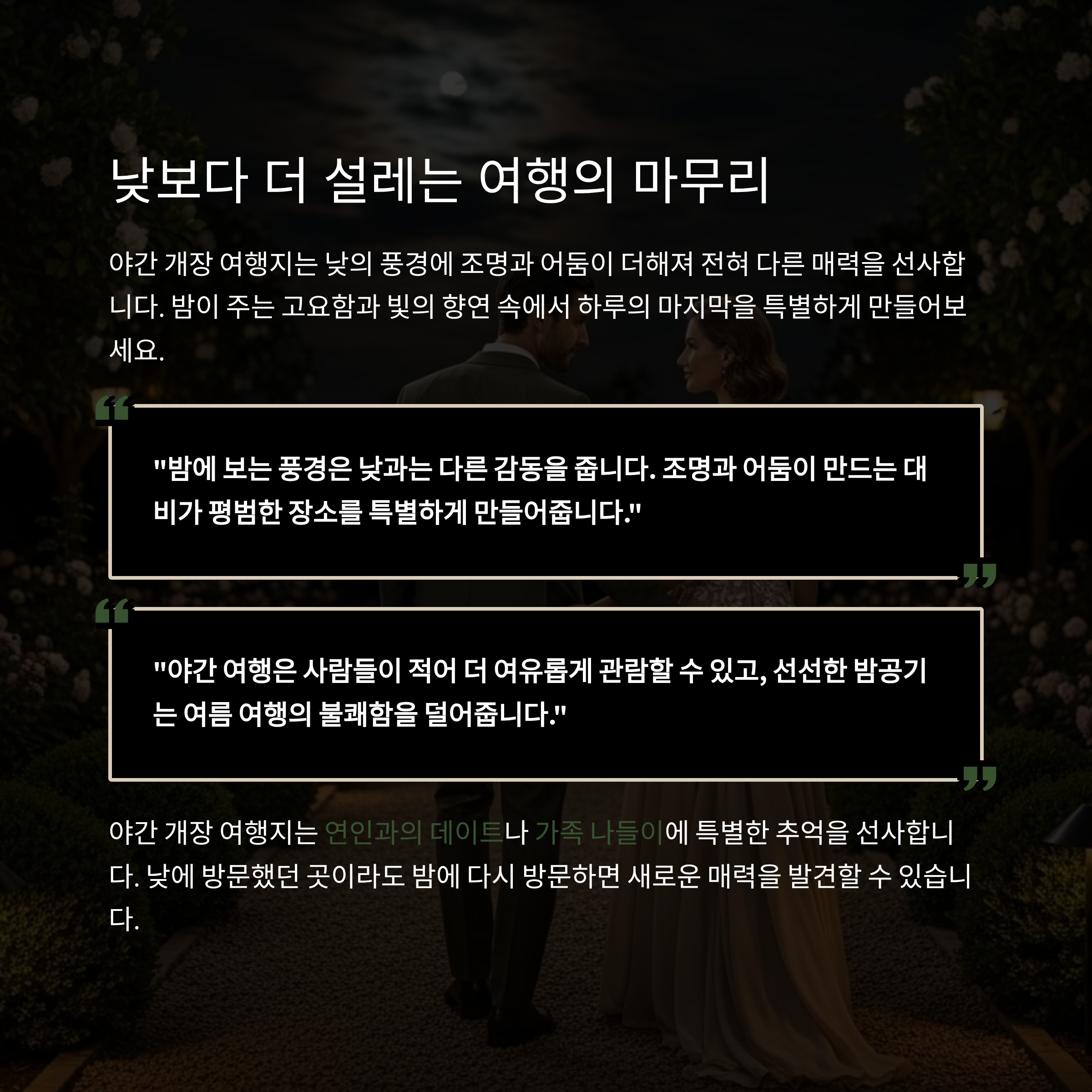 낮과는 전혀 다른 분위기를 선사하는 야간 개장 여행지가 있습니다.
