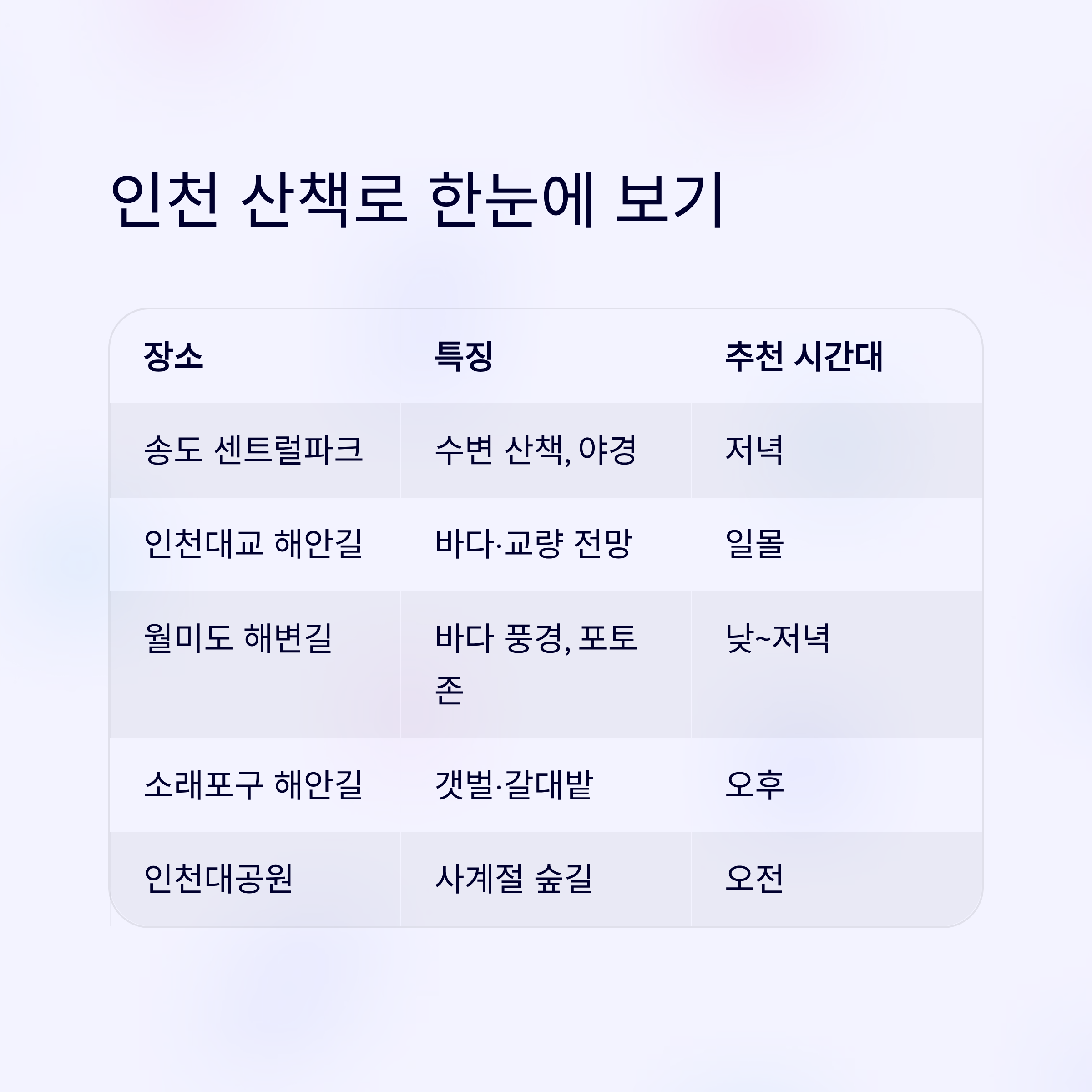 인천은 바다와 강, 공원이 조화를 이루는 산책 명소가 많습니다.