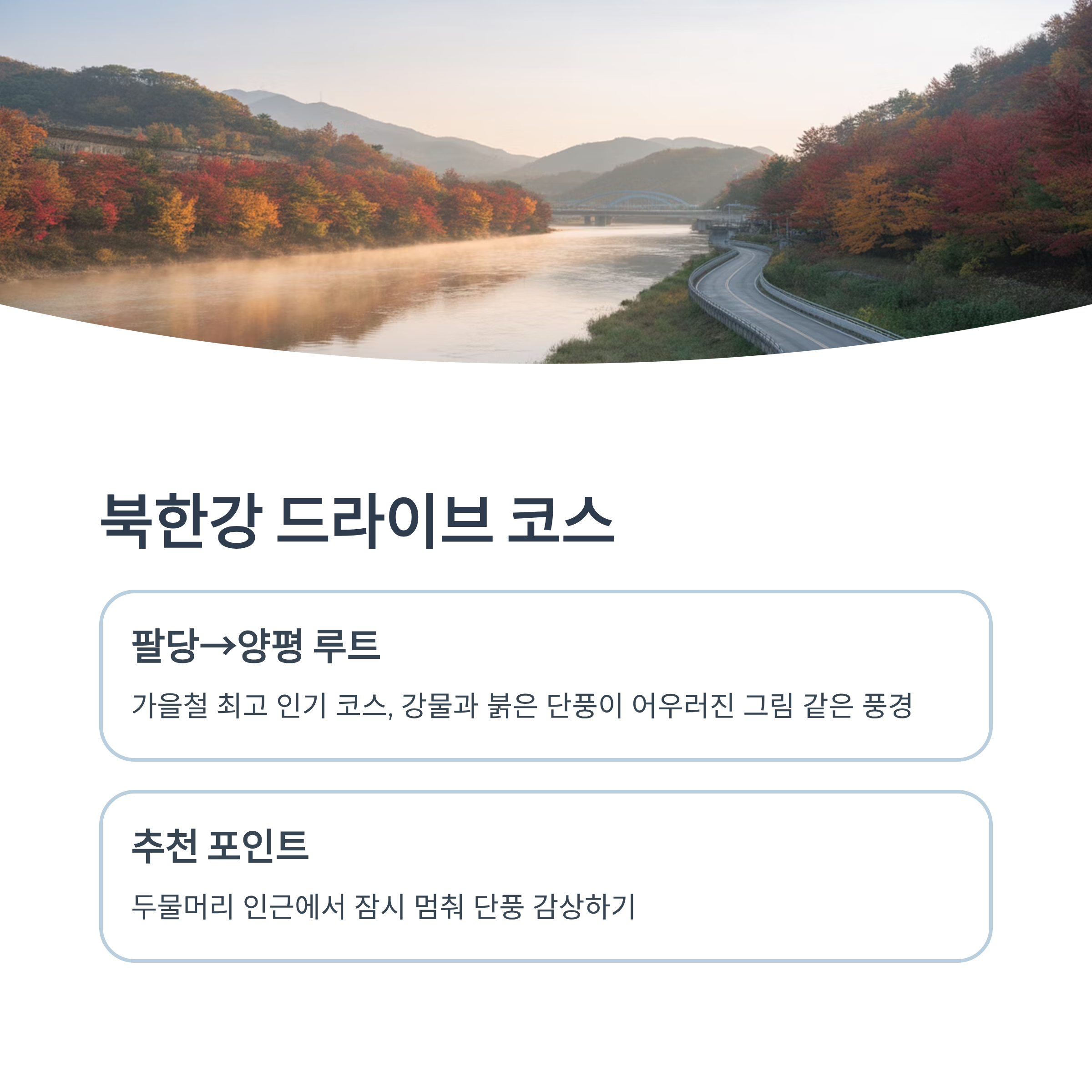 | 북한강변 도로 | 강물과 단풍 조화 | 10월 중순~말 |