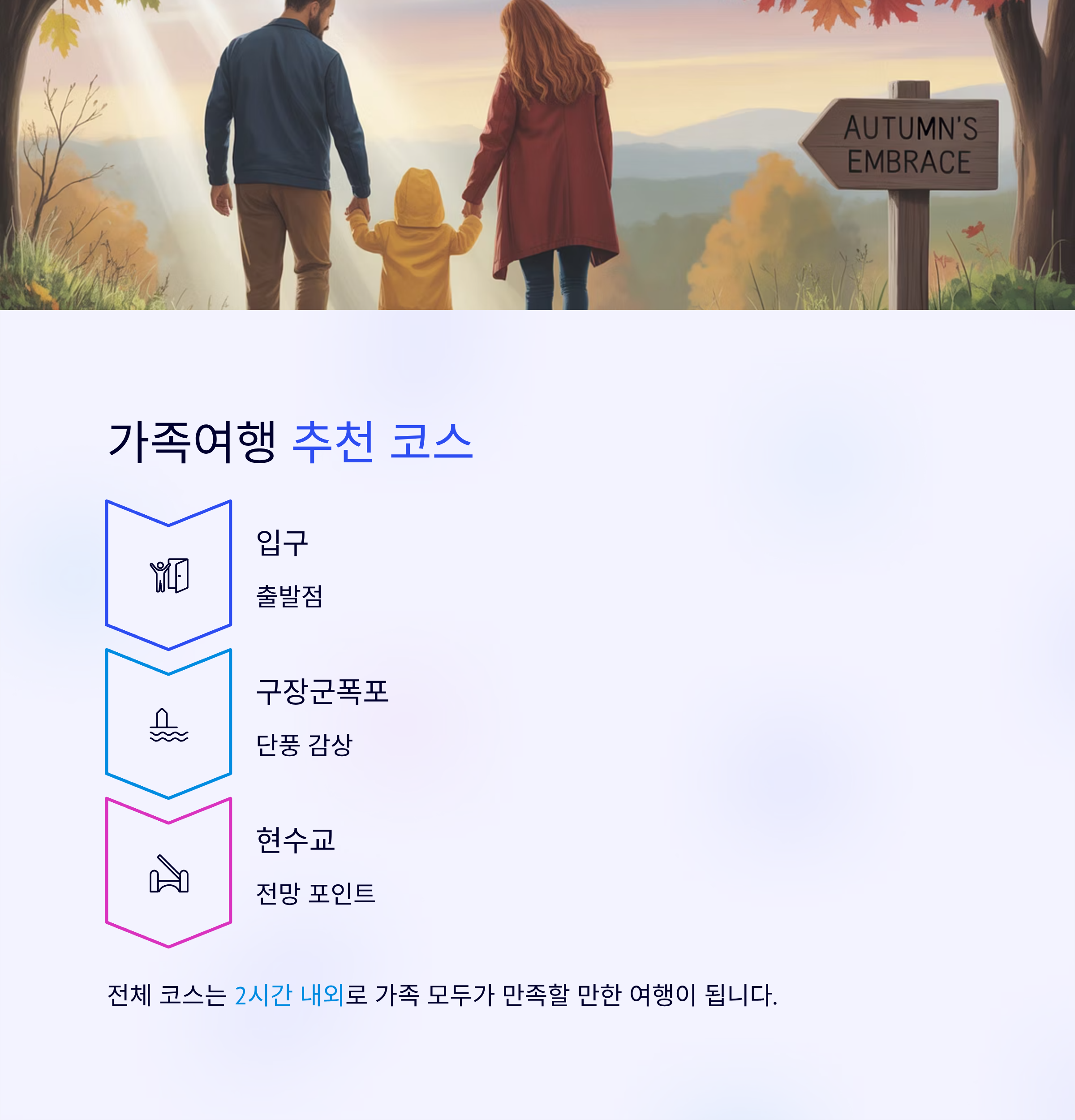 전체 코스는 2시간 내외로 무리가 없으며, 가족 모두가 만족할 만한 여행이 됩니다.