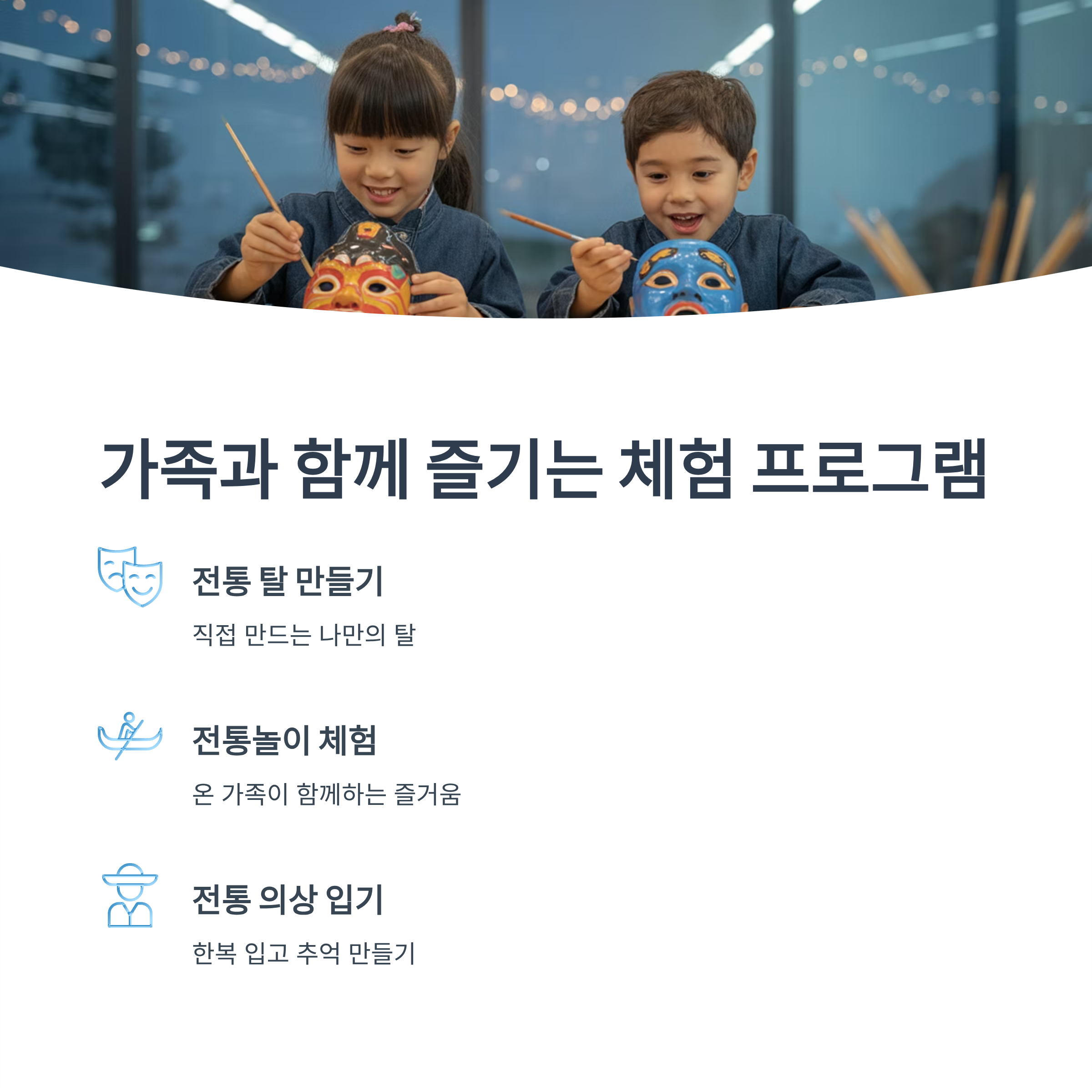 어린이를 위한 전통 탈 만들기, 전통놀이 체험, 의상 입기 등이 준비되어 있어 가족 단위 방문객에게 큰 인기를 끌고 있습니다. 남녀노소 모두가 함께 즐길 수 있는 체험형 프로그램이 축제의 매력입니다.