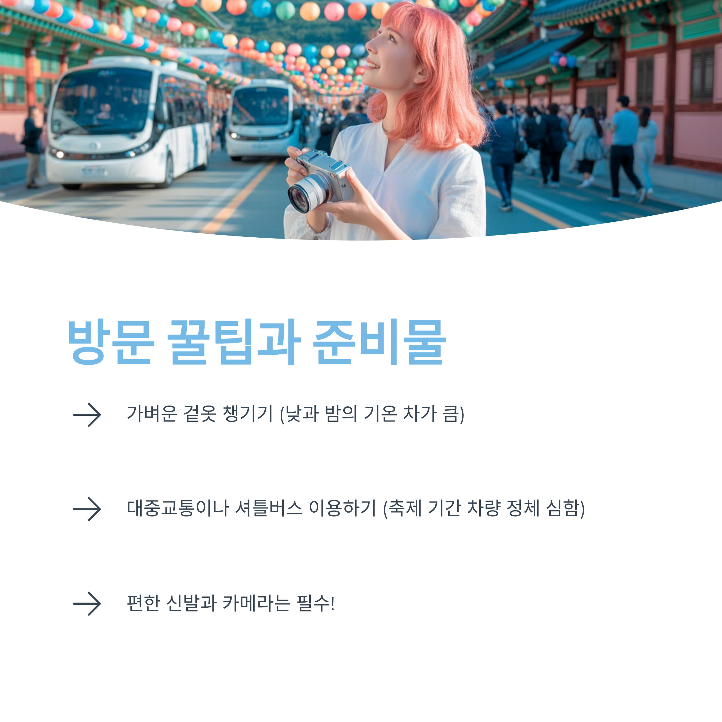 9월은 낮과 밤의 기온 차가 크기 때문에 가벼운 겉옷을 챙기는 것이 좋습니다. 또한 축제 기간에는 차량 정체가 심하니 대중교통이나 셔틀버스를 이용하는 것이 편리합니다. 편한 신발과 카메라는 필수입니다.