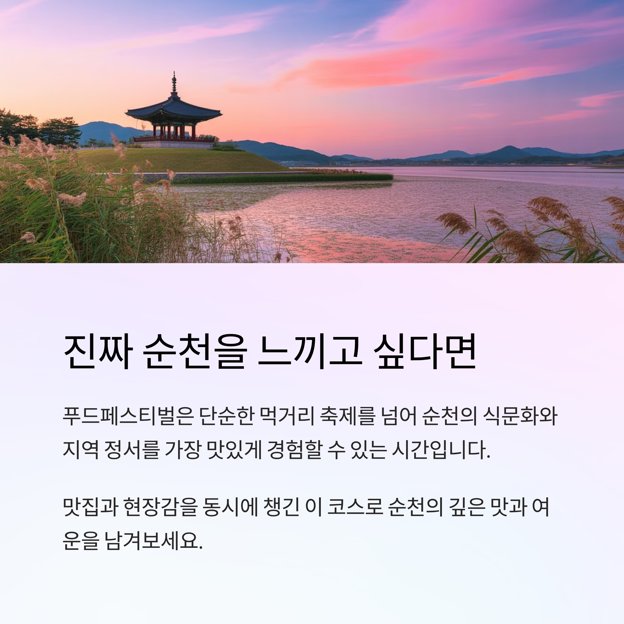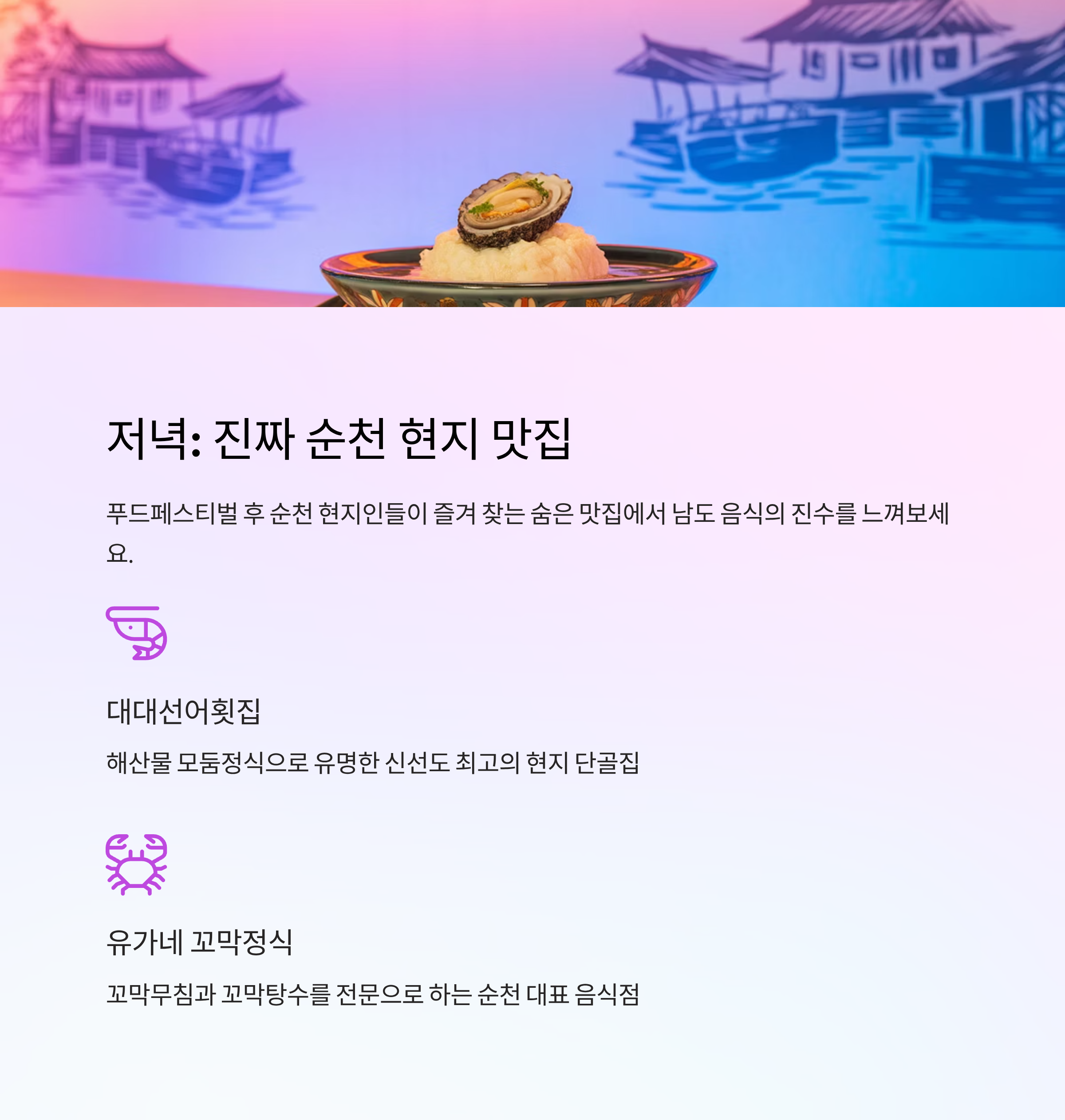 순천의 식문화와 지역 정서를 가장 맛있게 경험할 수 있는 시간입니다.