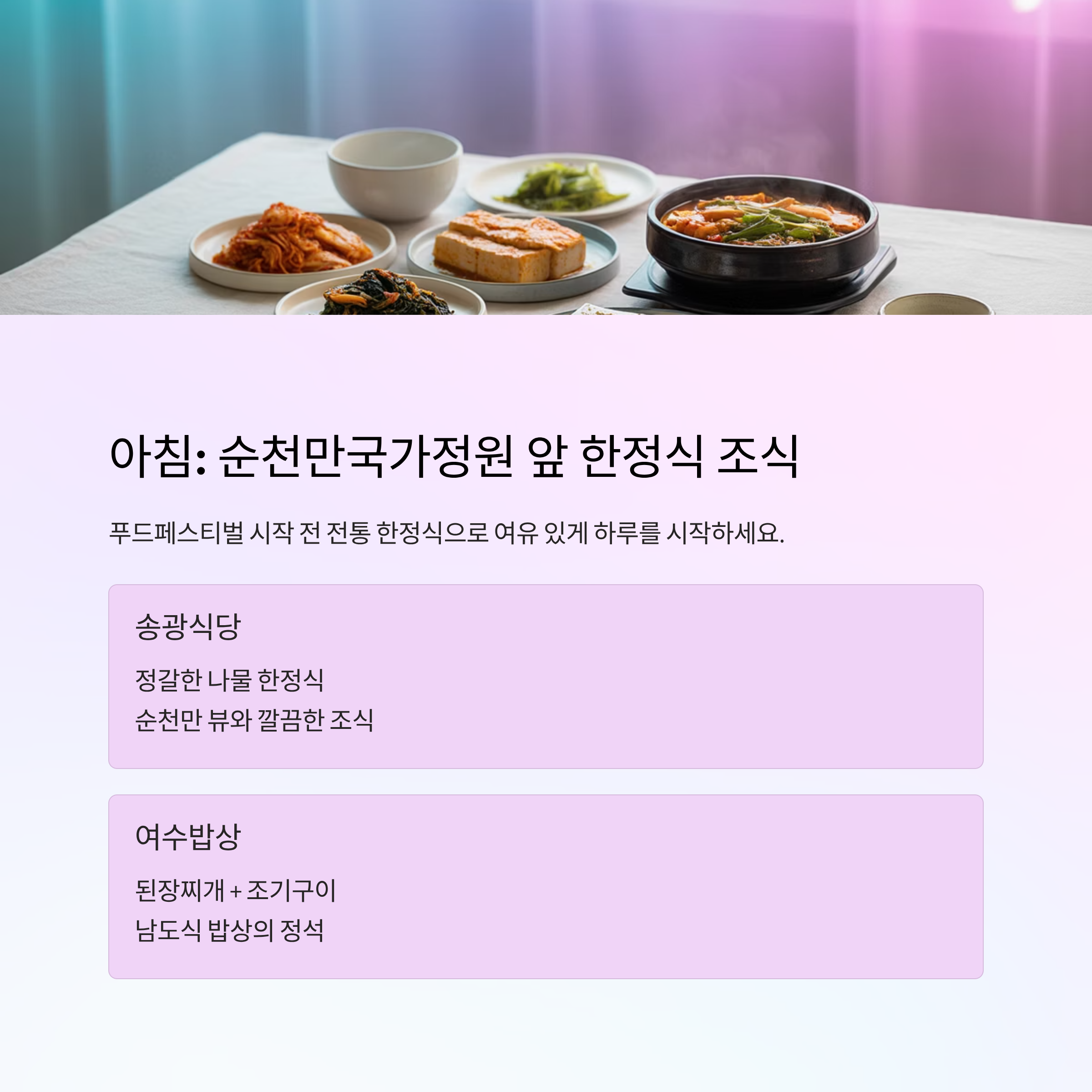 남도 음식의 본고장 순천에서는 매년 푸드페스티벌이 열려 진짜 순천다운 음식들을 한자리에서 만날 수 있습니다. 하지만 축제장만 돌아보다 보면 정작 놓치기 쉬운 게 바로 현지 맛집들입니다. 이 글에서는 푸드페스티벌과 함께 즐기기 좋은 순천 현지 맛집들을 하루 코스로 엮어 소개합니다.