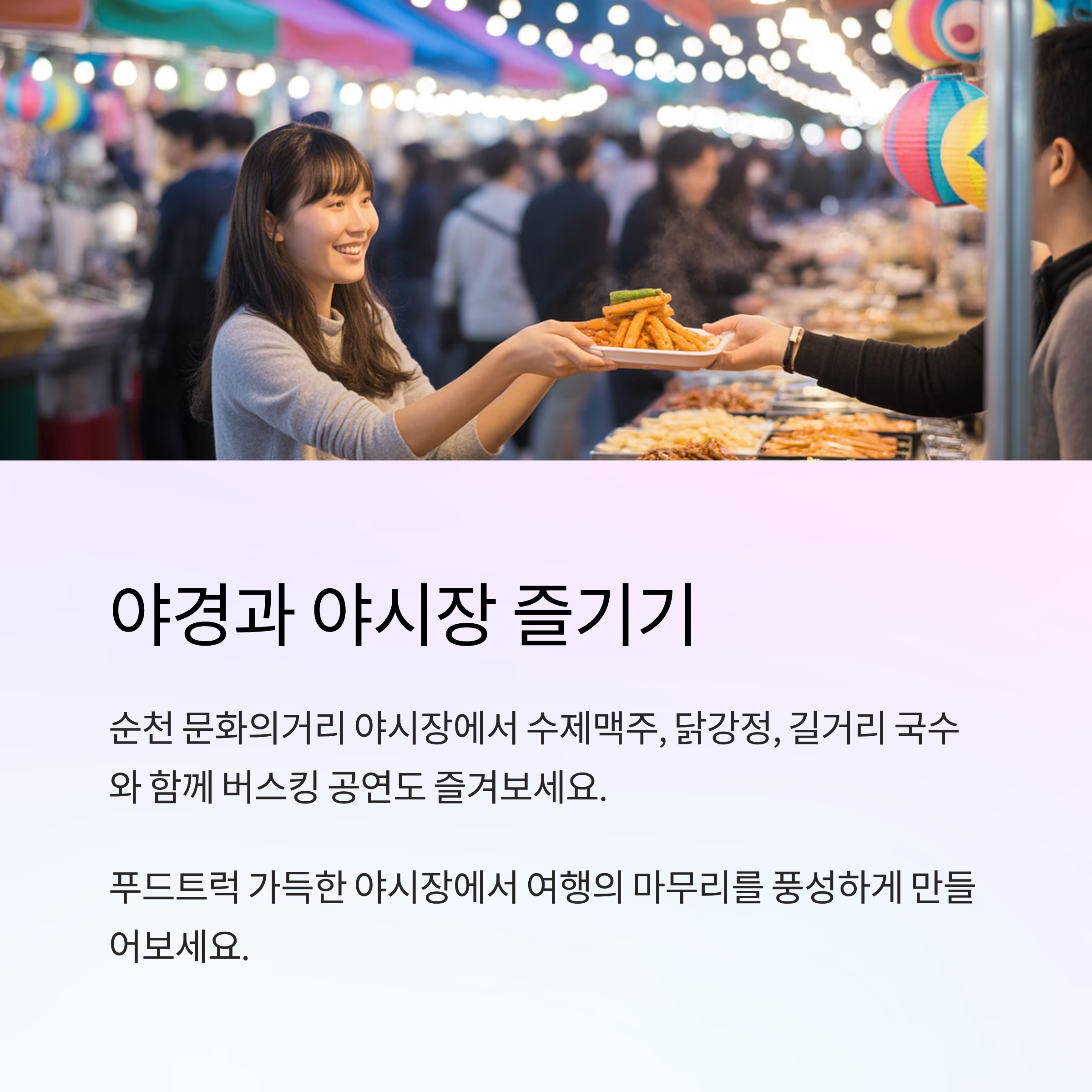 저녁 식사 후에는 순천 문화의거리 야시장도 꼭 들러보세요.