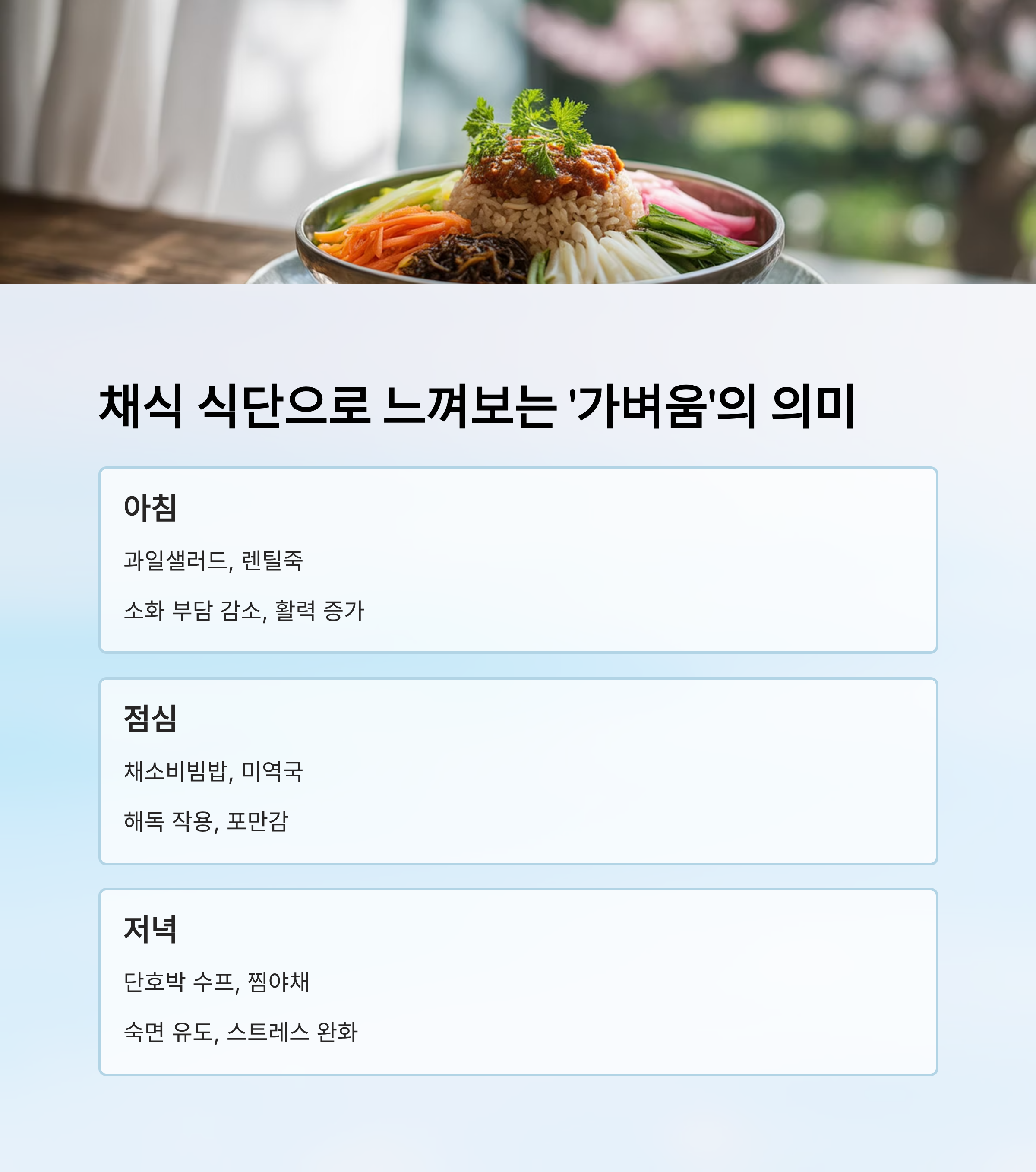 | 아침 | 과일샐러드, 렌틸죽 | 소화 부담 ↓, 활력 ↑ |