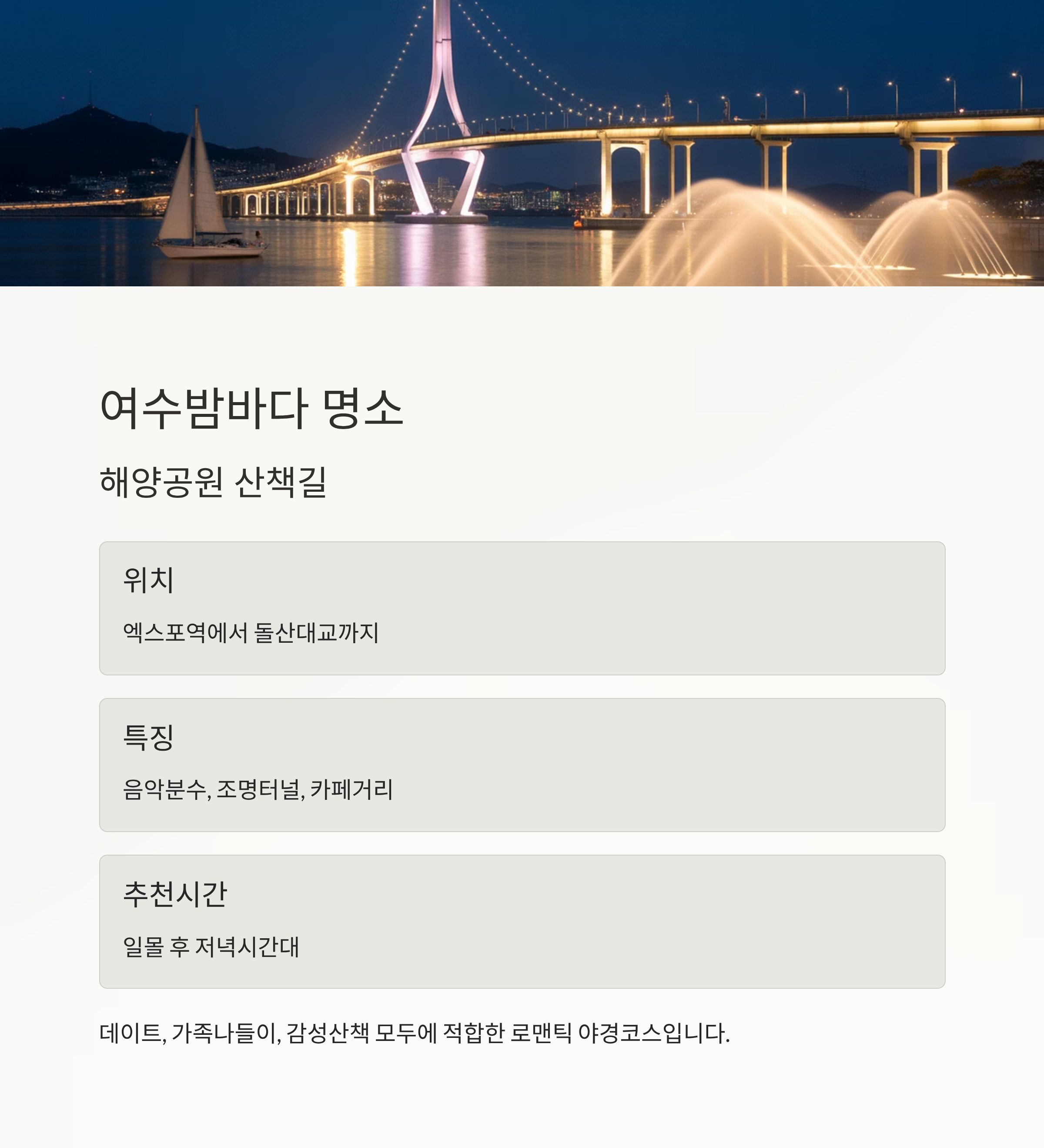 | 해양공원 일대 | 조명, 분수, 오션뷰 | 일몰 후 저녁 시간대 |