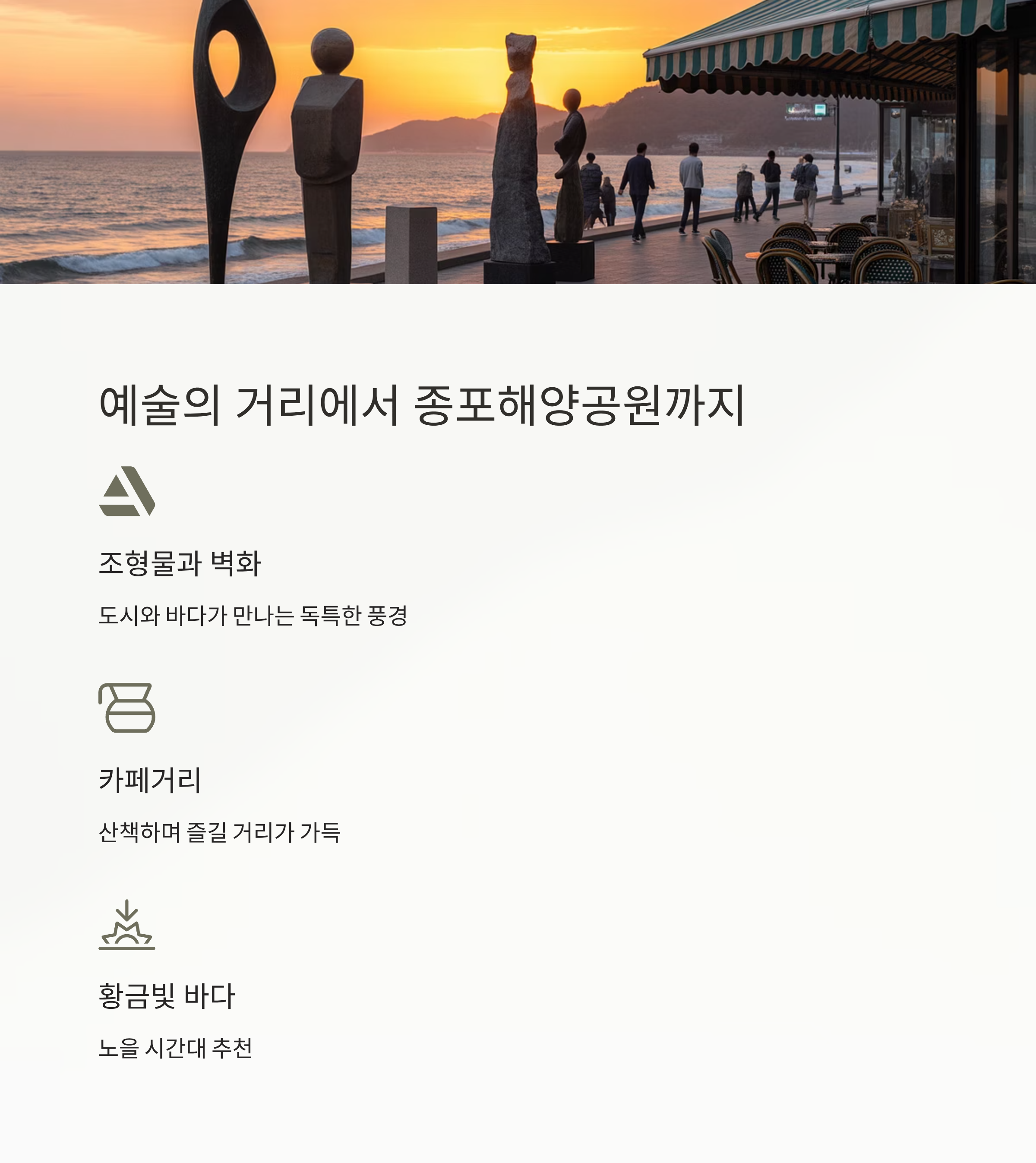 | 예술의 거리 | 도심+바다 감성 | 노을 시간 |